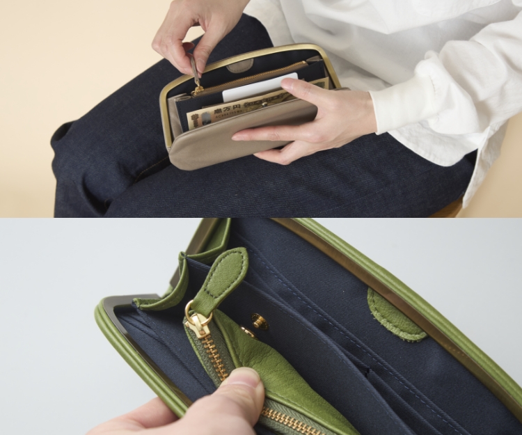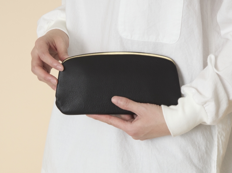 上質な素材を使用しているからこそ、デザインは極力シンプルに。革の質感を最大限活かす、天溝式の口金を使用したシンプルで大人っぽいデザインです。