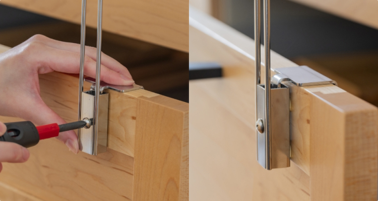 取り付けは簡単、ドライバー1本で引き出しに取り付けるだけです。厚み1.5cm〜2.4cmの引き出しまで取り付けが可能です。内側には滑り止め付きで、接触部分を保護しながらしっかり固定できます。