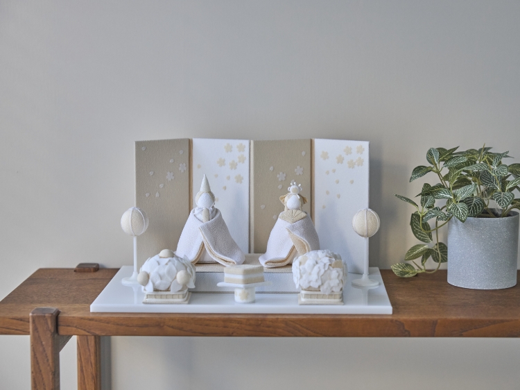 一方、こちらはお雛様とお内裏様だけでなく、菱餅や屏風といった道具類も白とベージュで統一。優しい色合いがインテリアに合わせやすく、自然と溶け込んでくれるのが嬉しいポイントです。