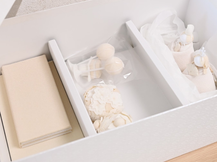 専用の箱に入れた状態でのお届けなので、飾るのも片付けもとっても簡単。桃の節句のお祝いを、気負わずより身近に感じていただけると思います。