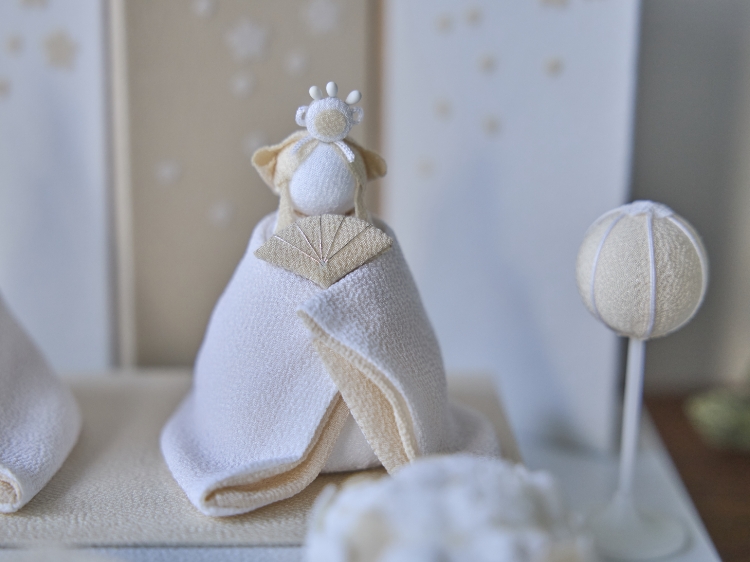 我が子に末永く幸せでいて欲しいという願いはいつの時代も変わりませんが、白はそんな思いをより強く表現する色でもあるんですね。柔らかな優しい表情を見せてくれるのも、生地に白いちりめんを使用しているからこそ。重なり合う生地の微妙な陰影や素朴な風合いを、存分にお楽しみいただける雛飾りです。