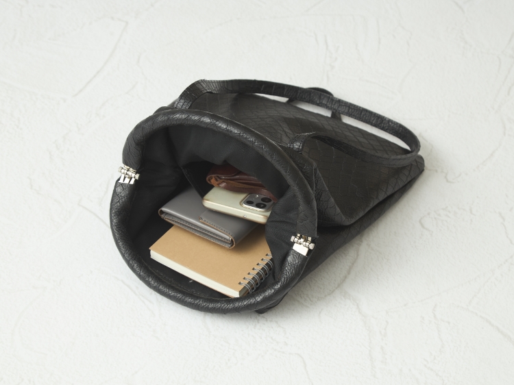 そして、口元にアルミフレームの口金を入れているのが特徴です。口がバネの力でガバッと大きく開くから中の荷物が取り出しやすく、簡単に閉められるようになっています。