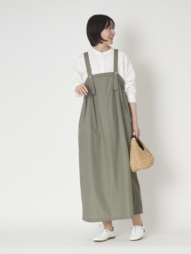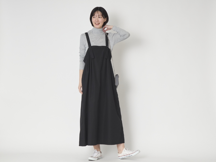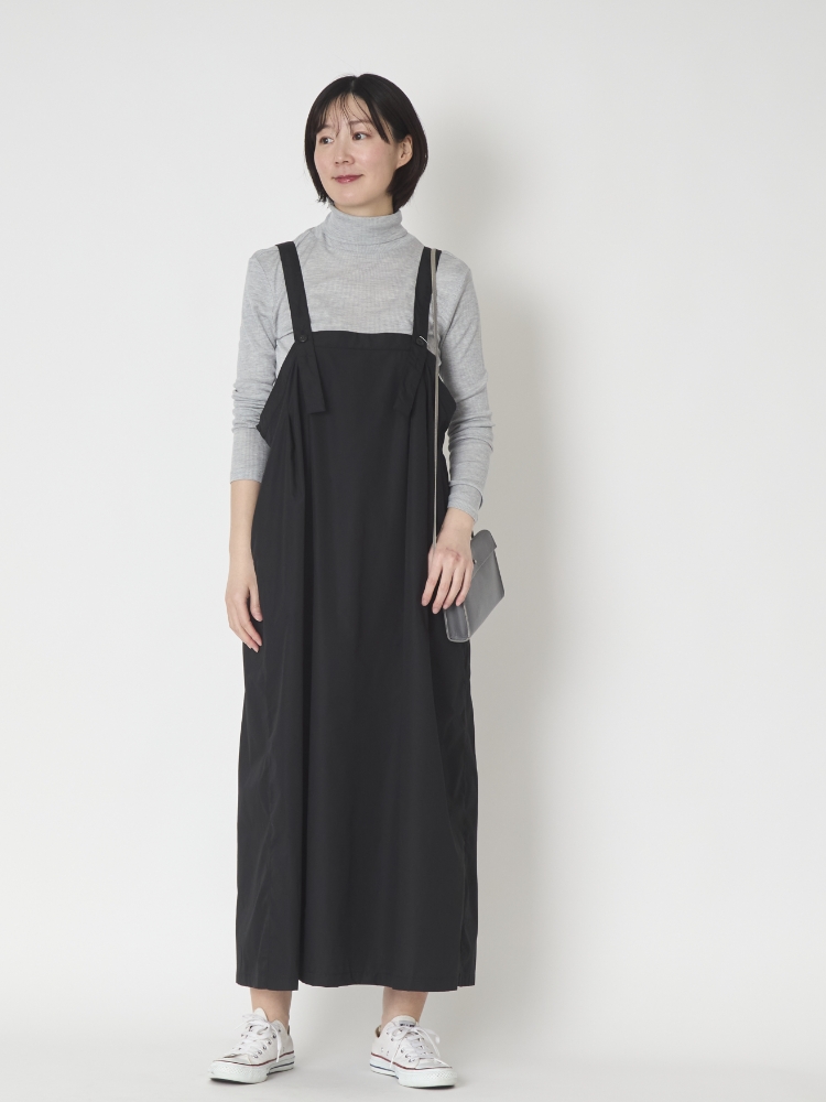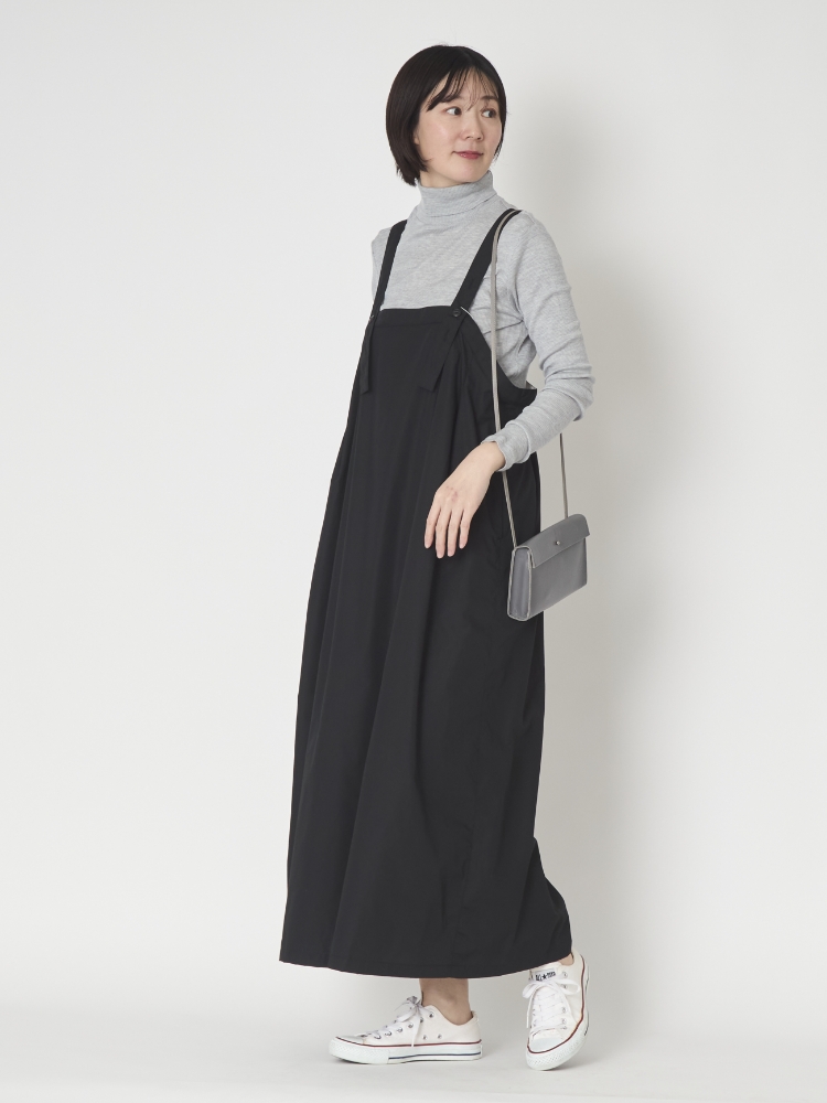 こちらは肩ひもは長さが3段階調整できるので、どんな体型、身長の方でも自分にあった丈で着られます。その日に履く靴とのバランスもとりやすいので、スニーカー、ブーツと履く靴を選ばず着られます。