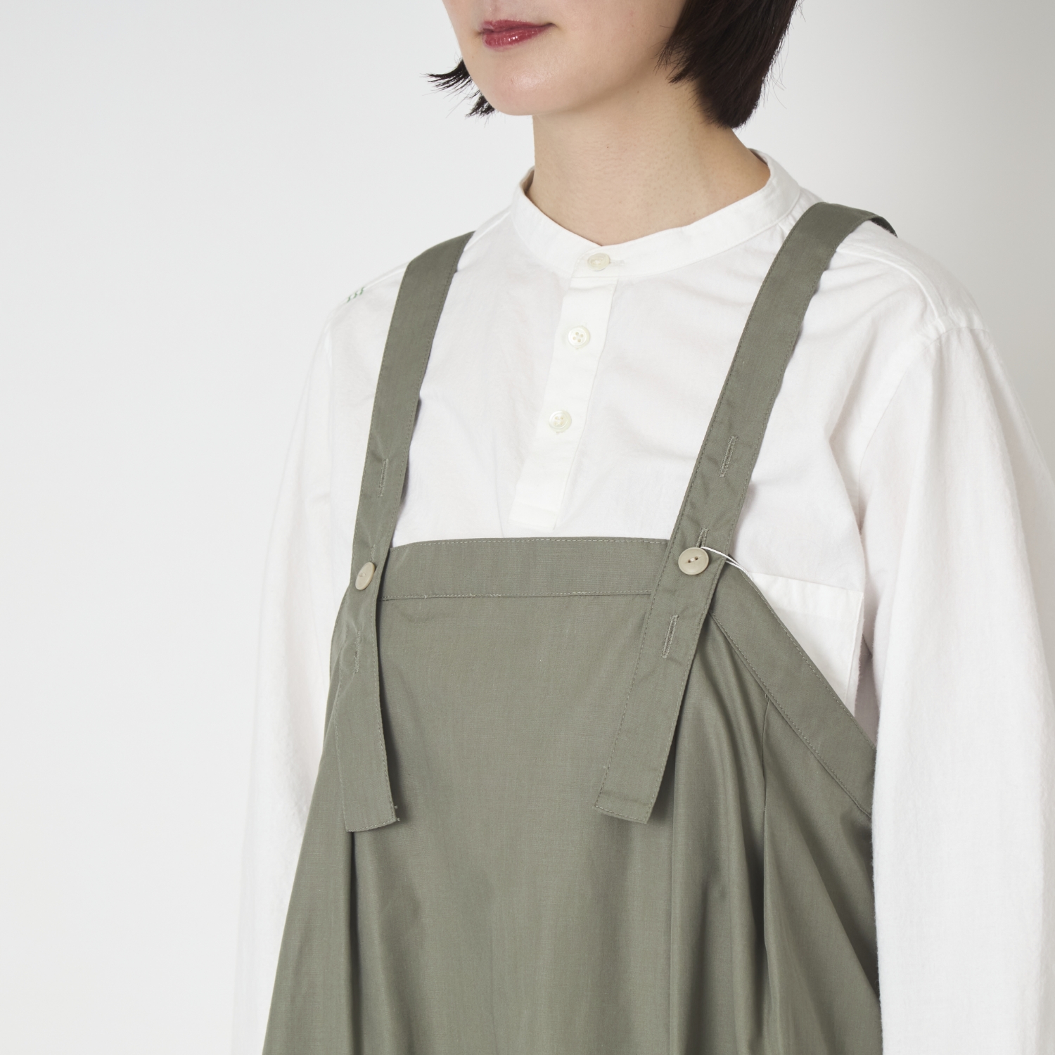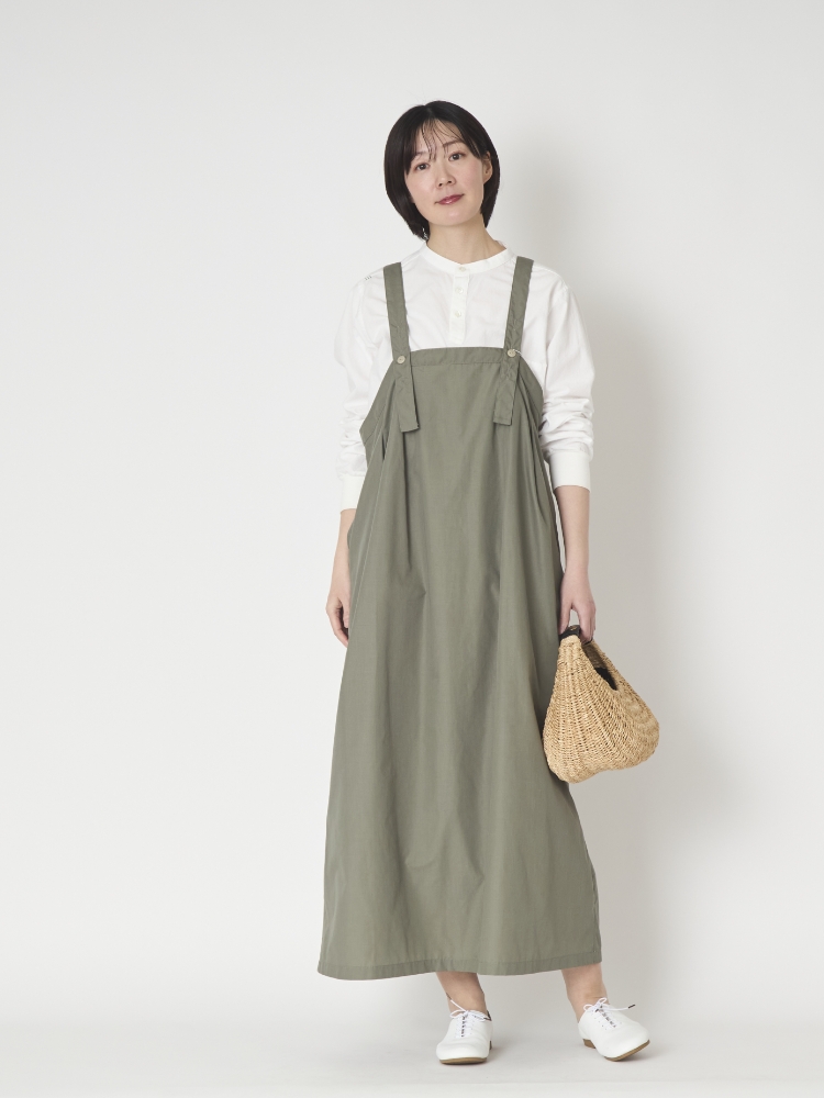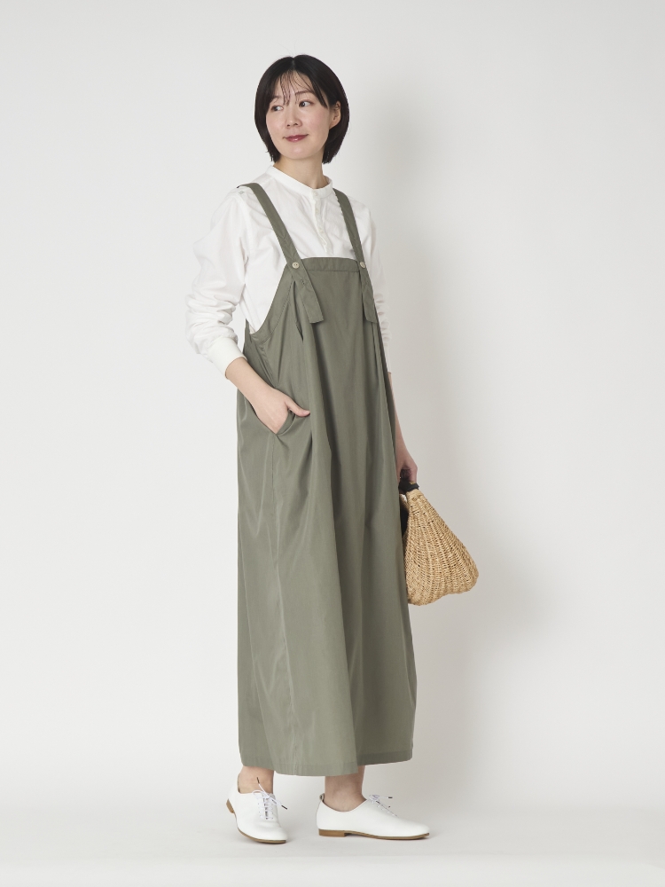 「軽くて肩に負担がないのがいいですね」と言われたのですが、私がいいなと思ったのがまさにそこ。これまで様々なジャンパースカートを見ましたが、その多くは肩ひもが細かったり、逆に太すぎたりと、着た時に肩に負担がかかりそうなデザインのものが多かったのです。でも、こちらは生地が軽いうえ、肩ひもも細すぎず、あくまでもシンプル。着た時にストレスがかかりません。