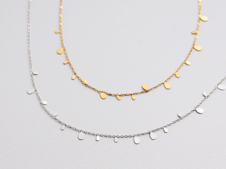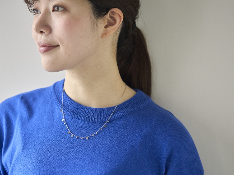 ネックレスにランダムについているのは、サイズが異なる涙型のパーツ。モチーフ自体が小さいのに、ミラーのように光を反射してきらきらと光ります。