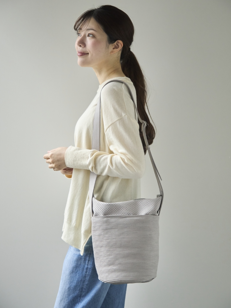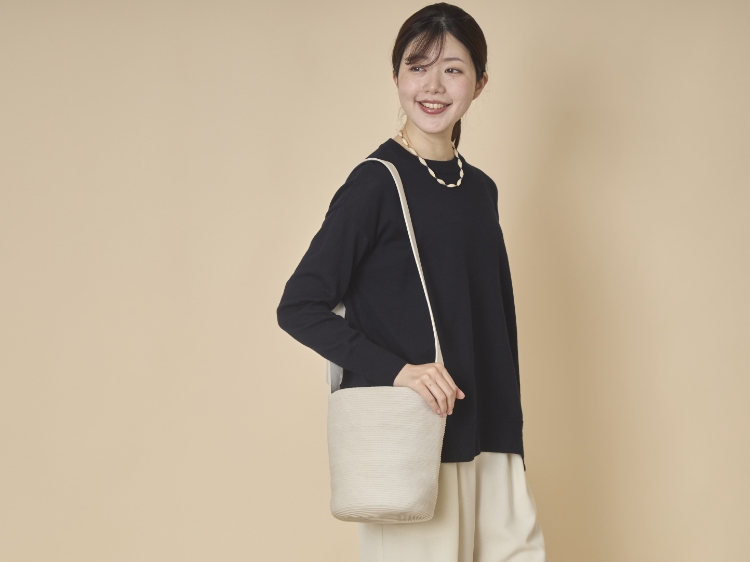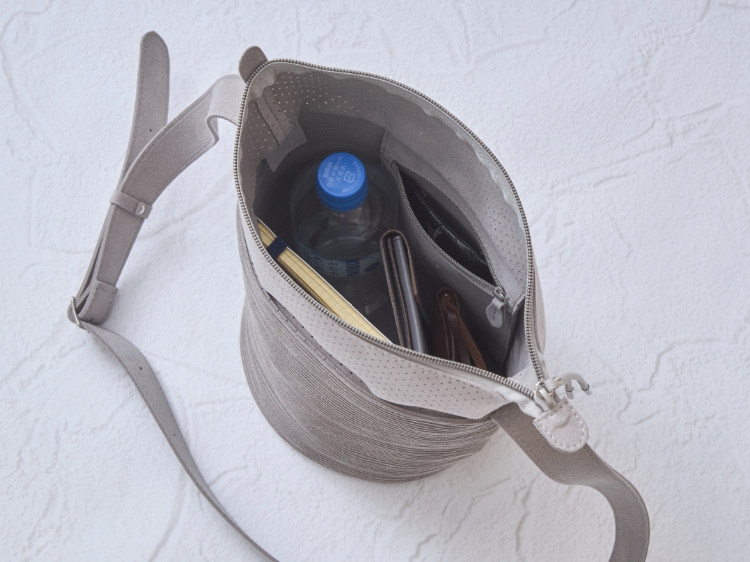 こちらはショルダータイプ。縦長なのですっきり見えますが、見た目以上の収納力があります。