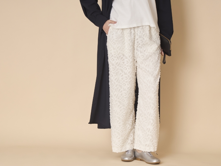 いつもとちょっと違うコーデをしたいけど、冒険しすぎるのは戸惑いもある。そんなときに穿きたいのがこちらのパンツ。ジャガード織りのフラワーモチーフは主張しすぎないのに、大人の女性らしい立体感と高級感があります。オンオフ問わず使えるので、あらゆるシーンで活躍するのも嬉しいです。