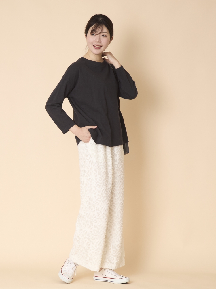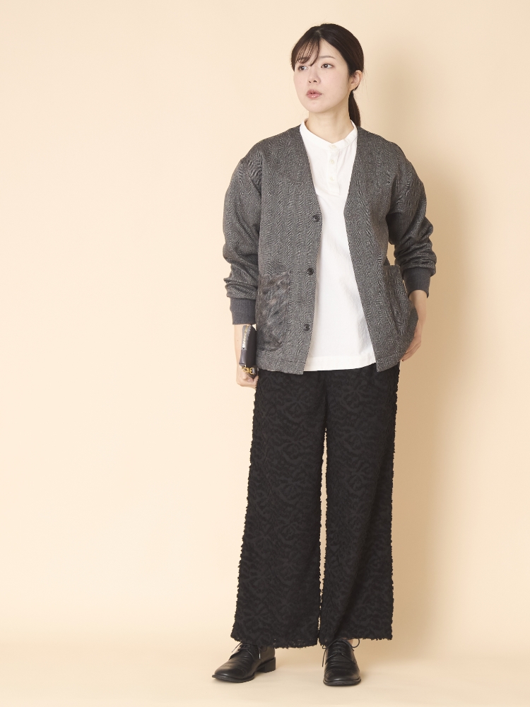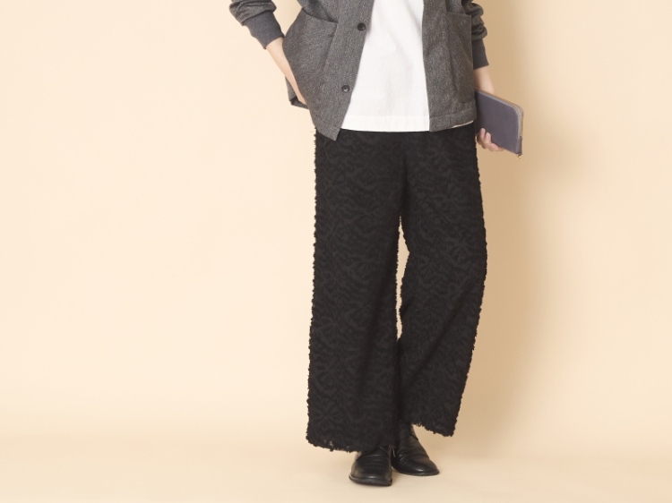 脱マンネリを目指したい方には、無地以上、柄未満の服がおすすめです。ジャガード織は生地そのものに柄を織り込み、糸の凹凸や陰影、手触りで柄を感じられることが特徴で、ここ最近は、このパンツのように糸をカットして表面をもこもこさせたパンツが店頭に並んでいるのをよく見かけます。