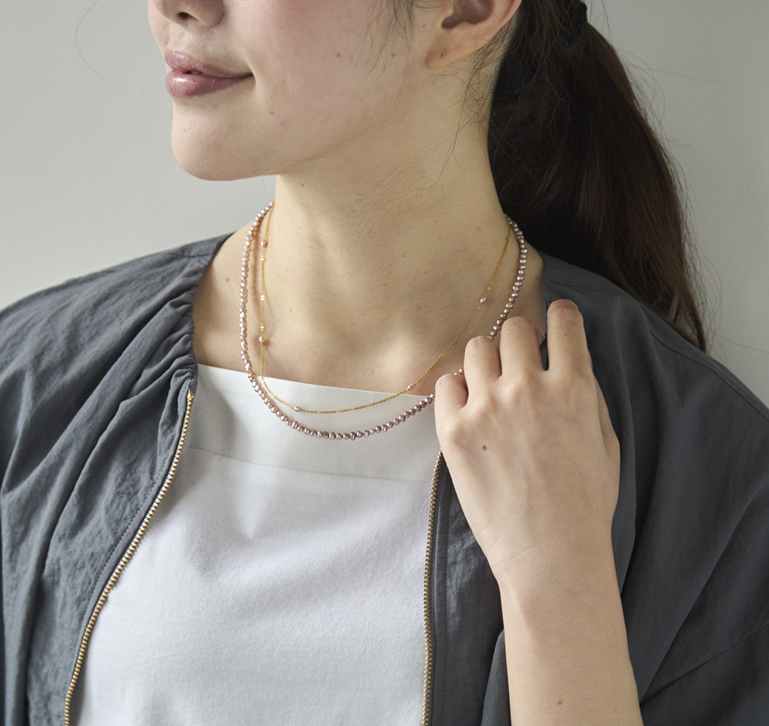当店のオリジナルブランド「Kilka」のために、ナチュラルピンクの淡水バロックパールで、マグネット式で長短2WAYで使える機能的なネックレスを制作してくださいました。