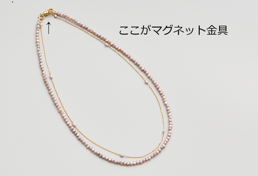 misaといえば2wayパールシリーズが10年以上のロングセラー。そのエッセンスがある、ロングとショートの2way仕様で、なおかつショートの場合はマグネット金具で着脱が簡単。2秒で着けられるネックレスです。