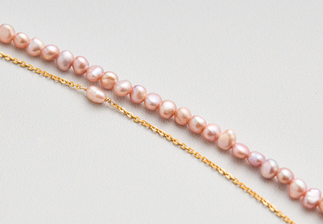 私は普段着として、無印良品などのシンプルな丸首ニットを愛用していますが、パールのネックレスが加わるだけで、ぐっと華やかに見えるもの。カジュアルな普段着に、真ん丸のパールだと、ネックレスだけ格式高い…なんてこともありますが、淡水バロックなら大丈夫。ニュアンスのあるナチュラルピンクは、白パールとは違った大人っぽい雰囲気があります。