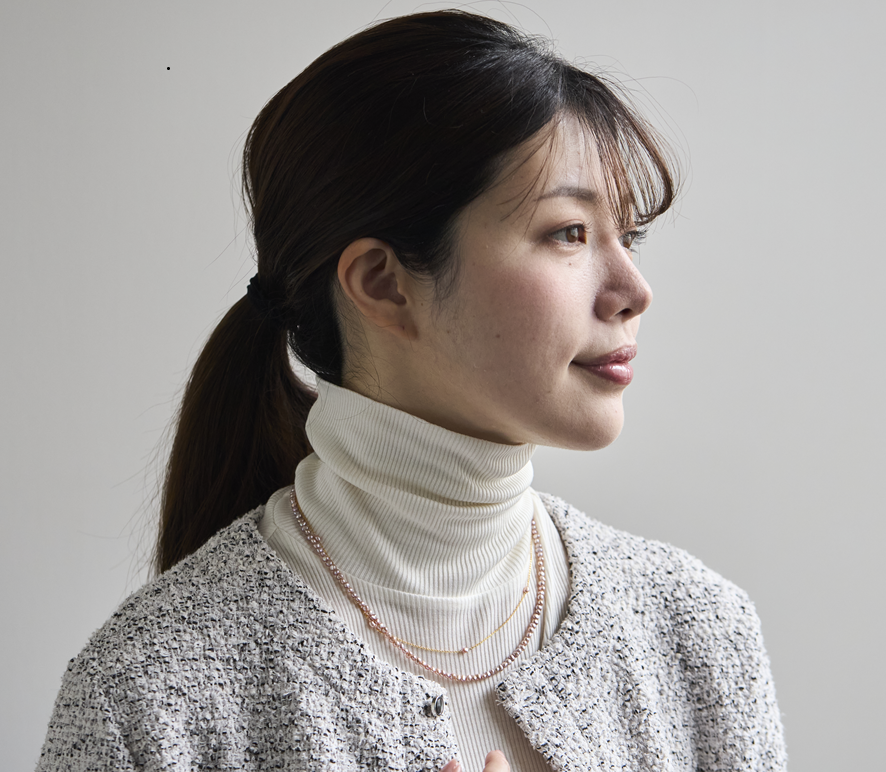 ネックレスは約9gと軽量で、着けているのを忘れるほど。しかし、照りのあるパールのお陰で、見た目にはちゃんとインパクトがあり、カジュアルな服装でも華やかに、品よくまとまります。