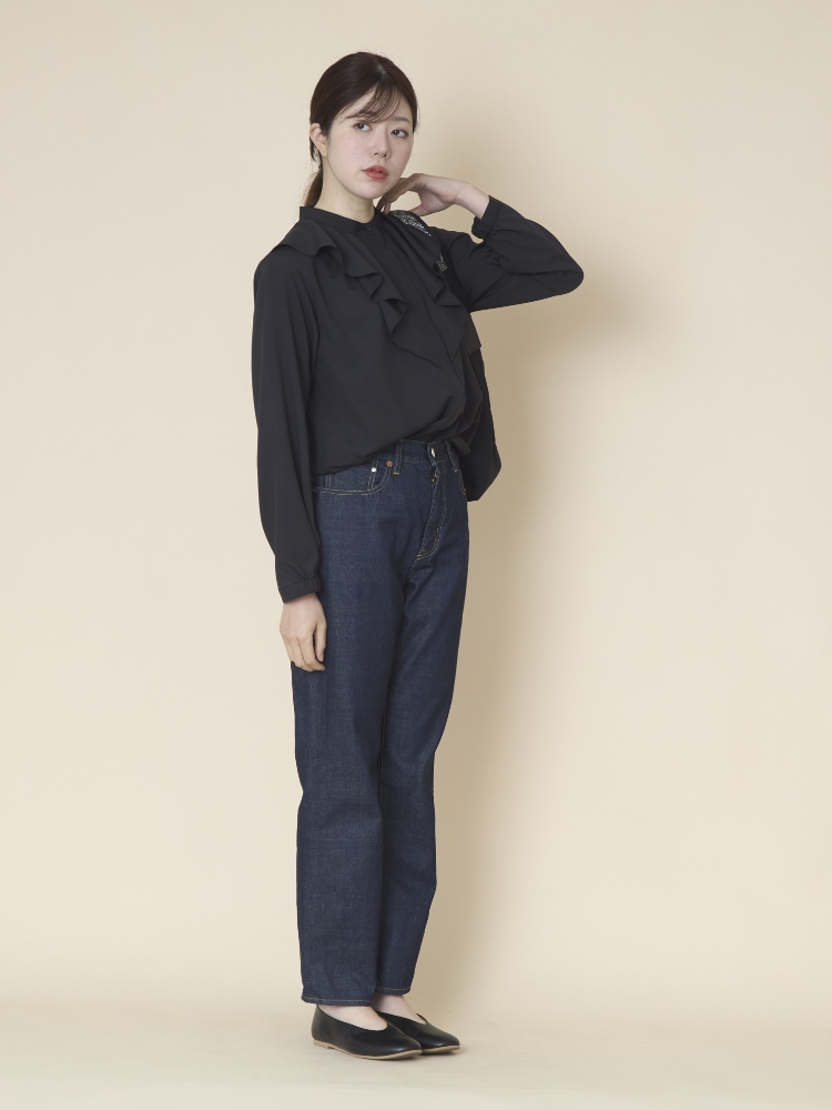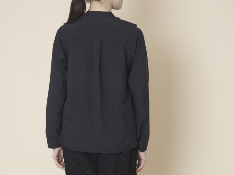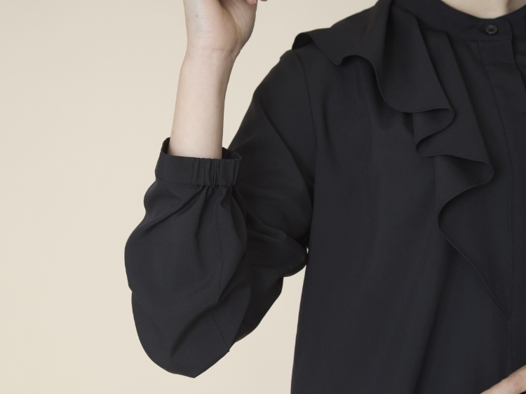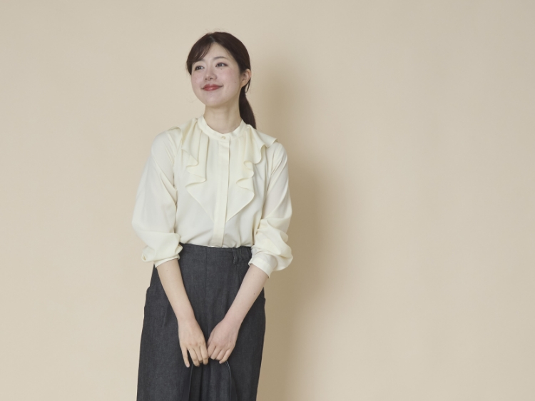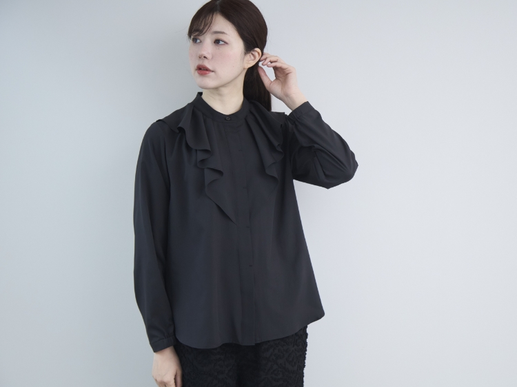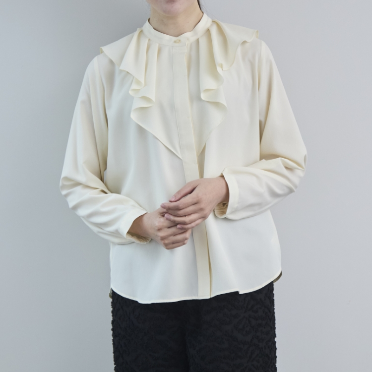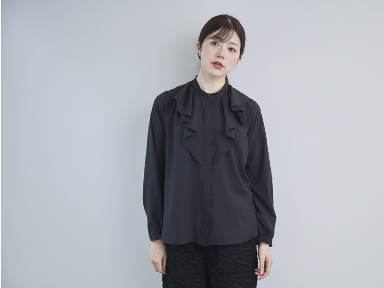 スタンドカラーのシンプルな比翼ブラウスをベースに、胸元にタックをたたんで挟み込んだフリルをあしらっています。ぱっと目に飛び込んでくるこちらのフリルのおかげで、アクセサリーを足さなくても、ブラウス1枚で華やかな雰囲気が出るのが最大のポイント。