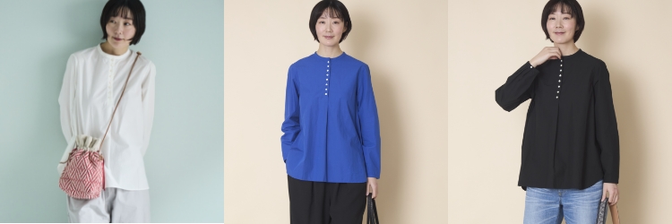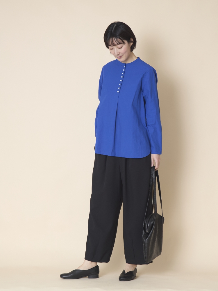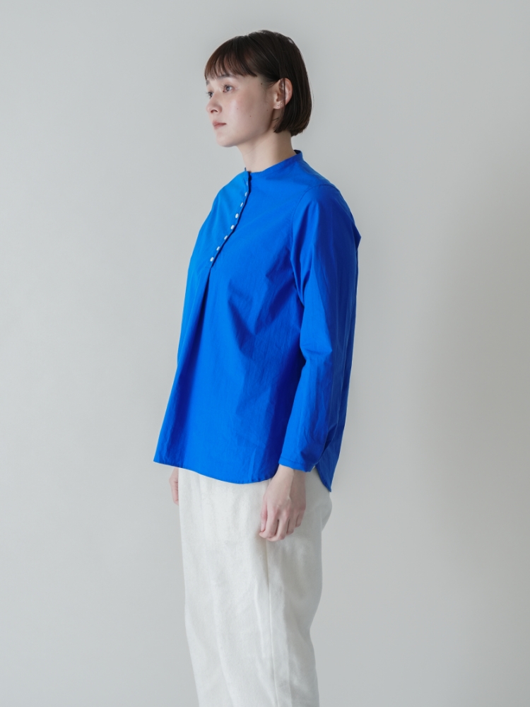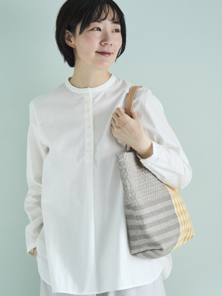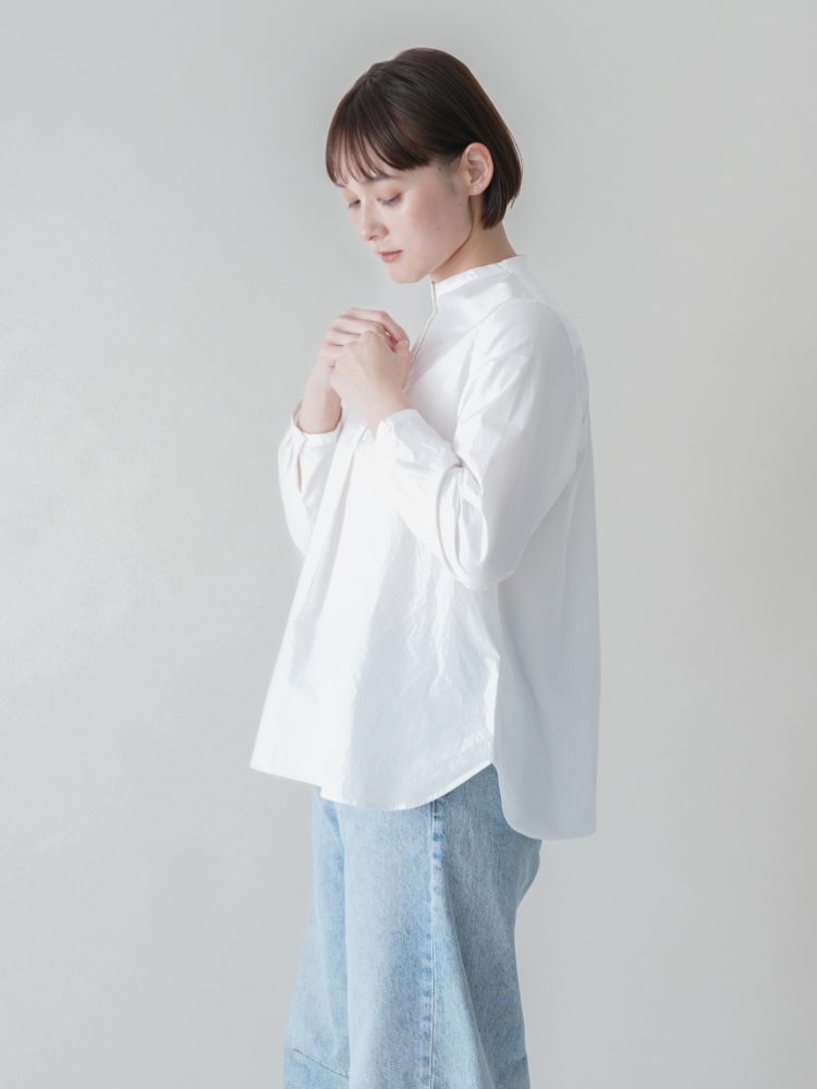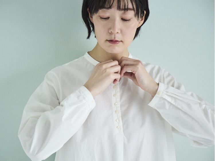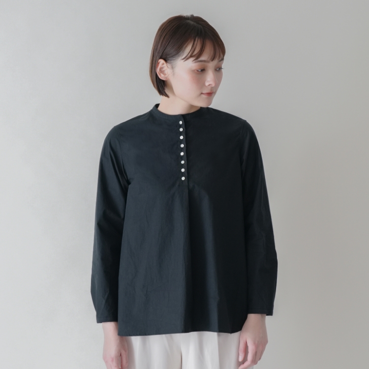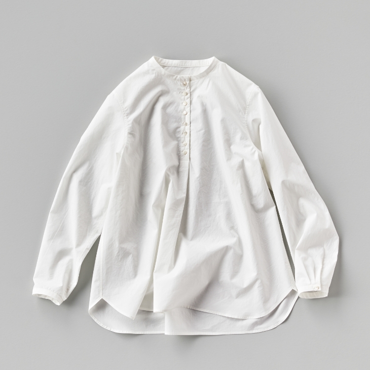 かぶって着るだけでサマになる、バンドカラーのプルオンシャツです。お行儀よく並んだ小粒の貝ボタンは視線を上に集めるのでスタイルアップ効果も。