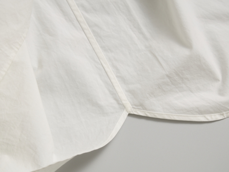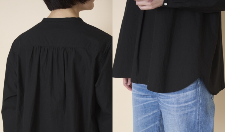 そこで詳しくお話を伺うと、シャトル織機という今では製造されていない貴重な機械で時間をかけて織りあげたふっくらとしたコットン生地を、パリコレに出展した国内ブランドの洋服も手掛ける工場で縫製したという、尋常ではないこだわりの詰まったブラウスだということがわかり、お取り扱いをすることに。