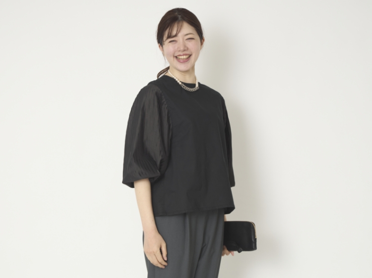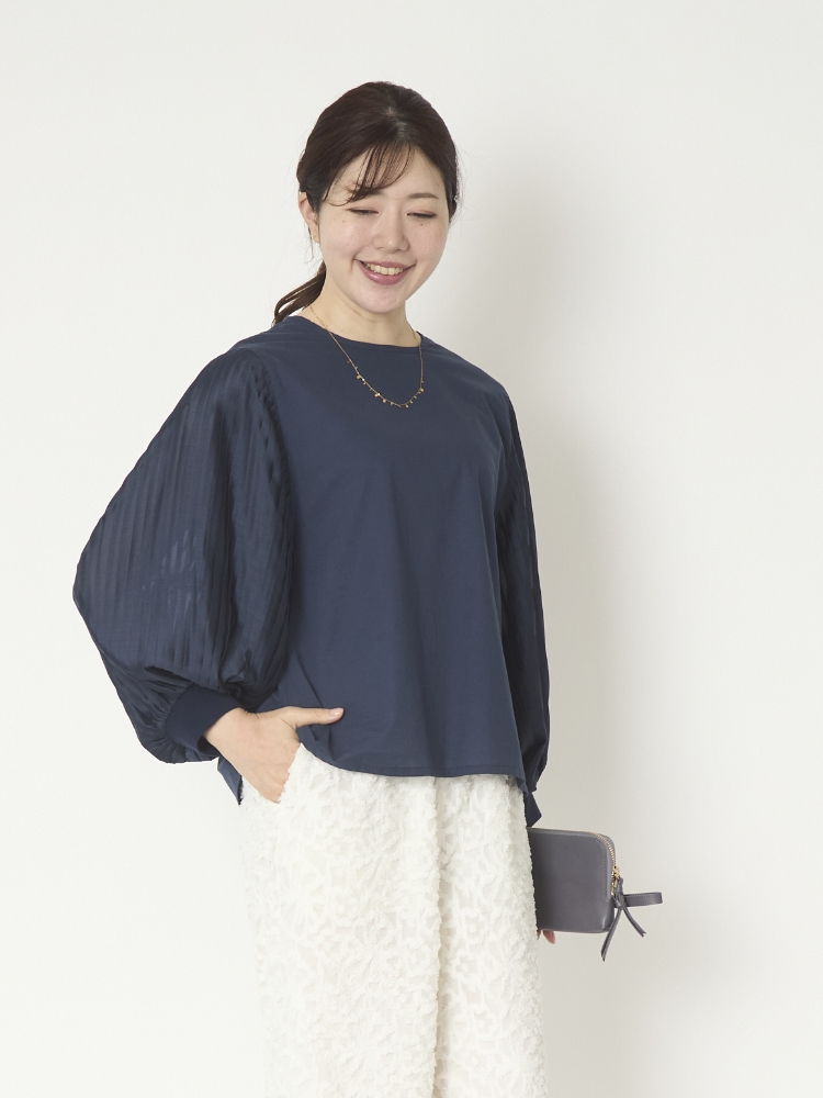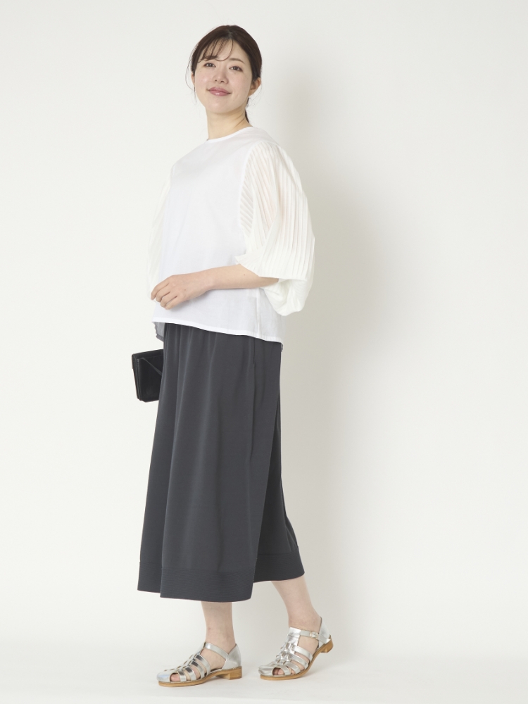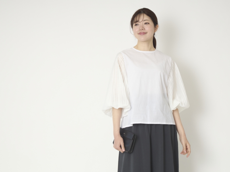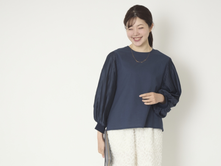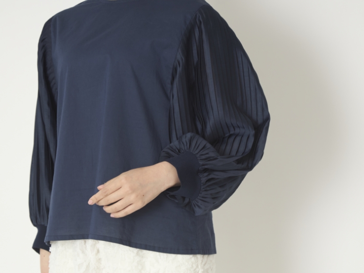 袖に施されたプリーツがアクセントになっていますが、品よく主張するデザインなので、お手持ちのパンツやスカートとも合わせやすいのがいいところ。
