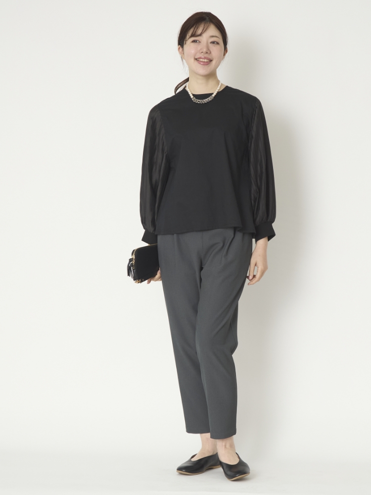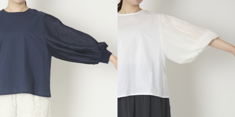 ボディー部分は綿100%のカットソー生地で、プリーツの袖部分はほんのり光沢のあるポリエステル素材の布帛生地。異素材の組み合わせなので程よくデザイン性がありますが、同系色でまとめているので、きちんとした感じが出るのがいいところです。