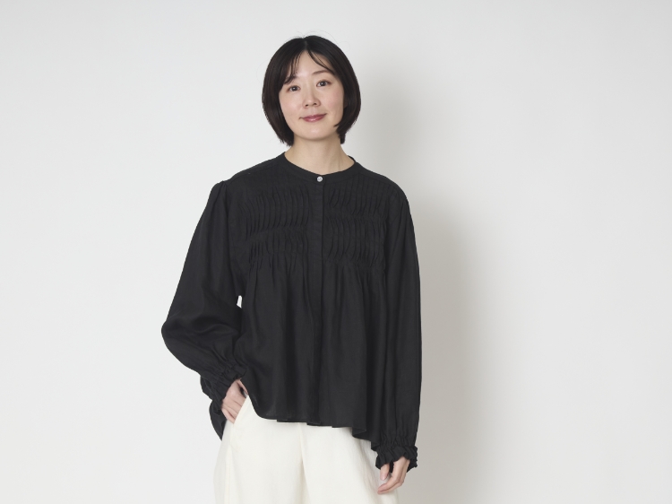 こちらのブラウスは細かなウェーブピンタックが、フロントから背中まで施されているデザイン。バスト約104cmと、シルエットはゆったりしていますが、ピンタックの縦のラインのおかげで着やせして見えます。「背中に肉がついてがっしり見えてしまう」という体系の変化によるお悩みにもこたえてくれます。
