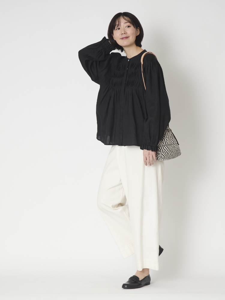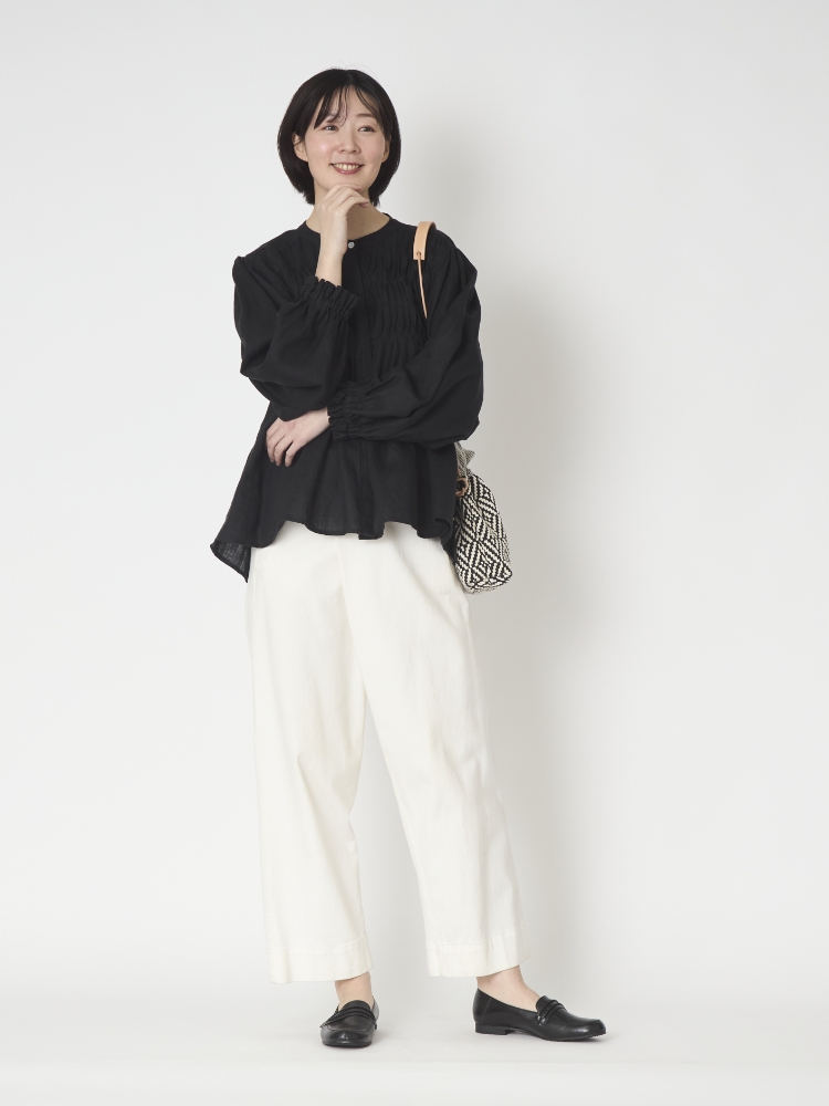 ゆったりとしたデザインのブラウスは、風通しが良く蒸し暑くなっても快適に着られるのが魅力ですね。でも、身幅が大きかったり、ギャザーがふんだんに使われていると、上半身にボリュームが出過ぎてしまうことも。