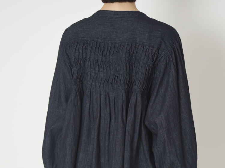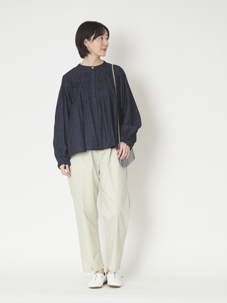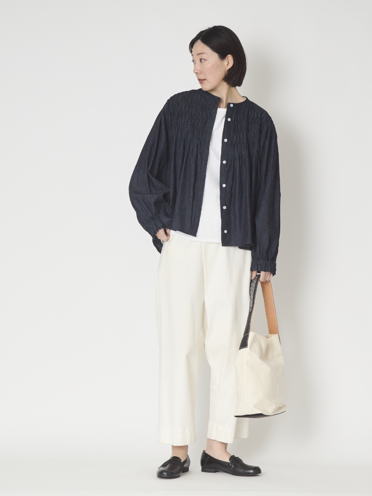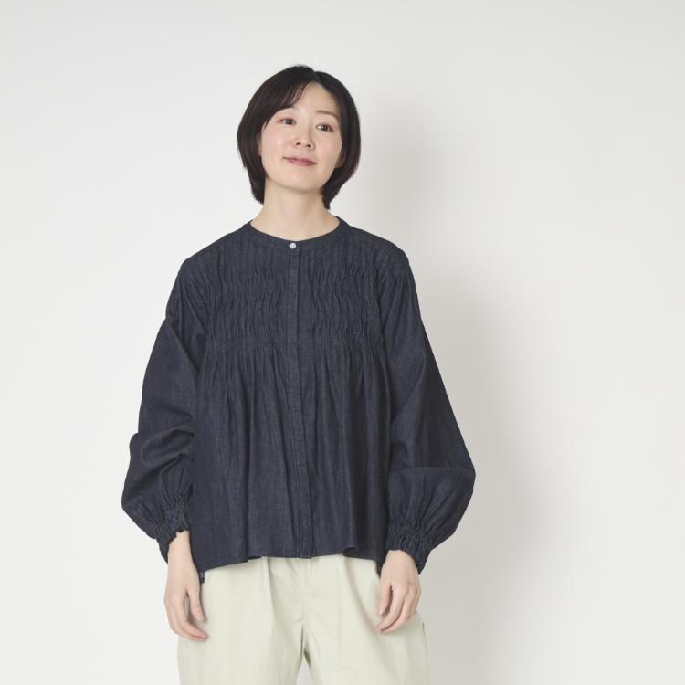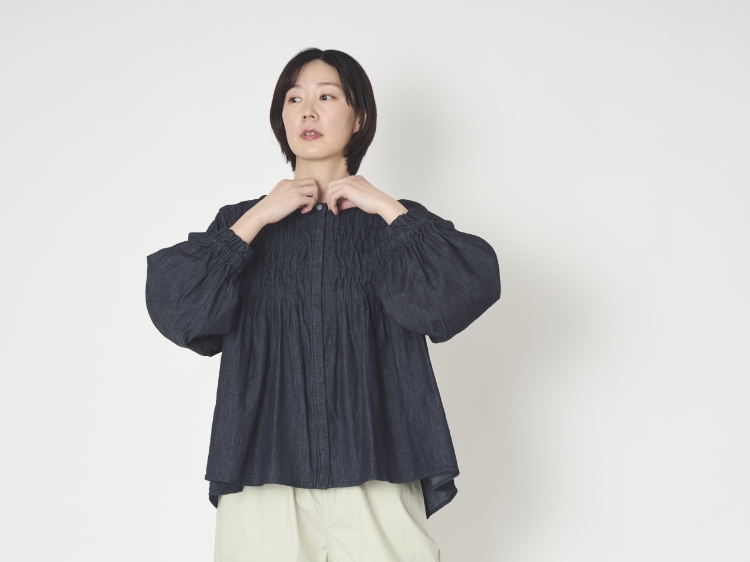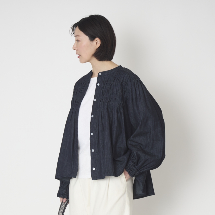 最近は気温が上がる時期が早まり、ブラウスを楽しめる時期が短く感じられることもありますよね 。こちらは、コットン70%、リネン30%のソフトデニム生地を使用。薄手の柔らかいデニムで、透け感がなく1枚で着られるので、春先から秋までずっと活躍します。