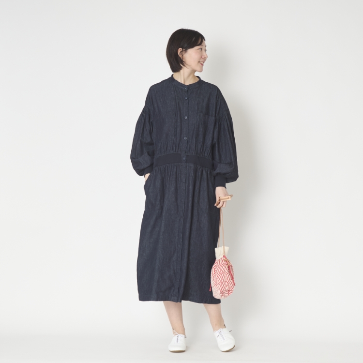 ubasoku/ウエストリブデニムワンピース 袖とウエストのリブがポイントになったデニムの前開きワンピース