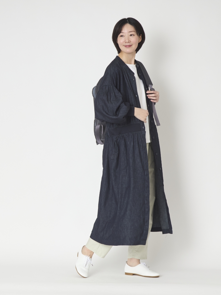ワンピースは1枚でサマになるから楽だけど、コーディネートがマンネリしやすいというデメリットも。こちらはボタンを開ければライトコートとして、重ね着コーデにも活躍してくれます。デニム素材なので羽織りとして着た時も格好よく決まり、さまざまなコーディネートで活躍してくれます。