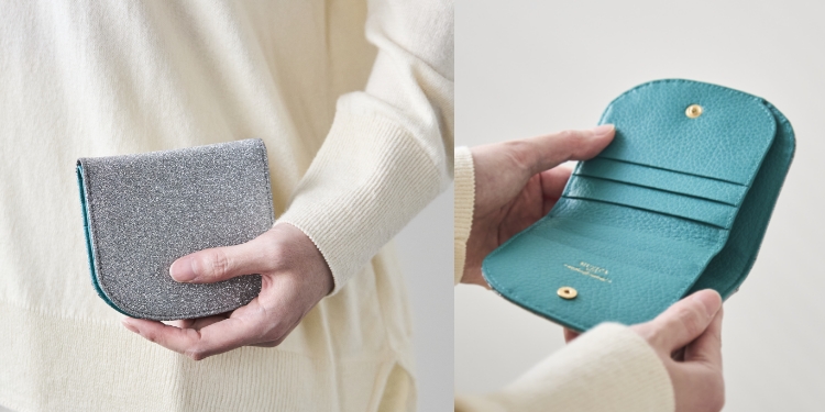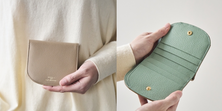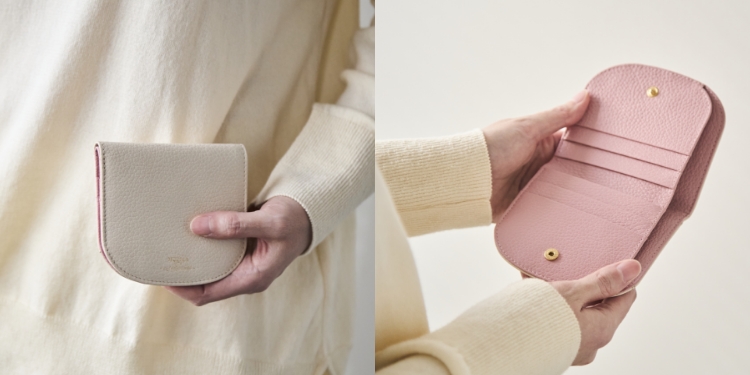 女性の手の中に納まるくらいのコンパクトなサイズ感が特徴の2つ折りミニ財布は、丸みのあるシルエットで、ブランドオリジナルの仕様です。