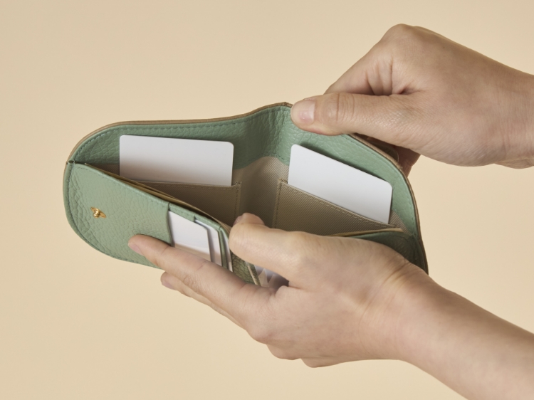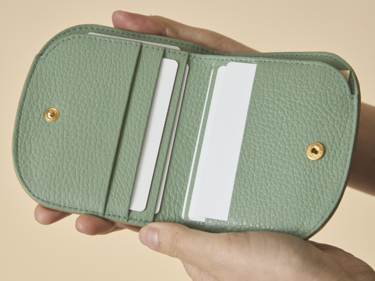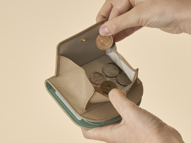ただ小さいだけではなく、使いやすさにもちゃんとこだわっています。小銭入れはお財布の裏側に配置。スナップを開けると、お札入れとカード入れが配置されています。お札は折らずに収納できる仕様です。