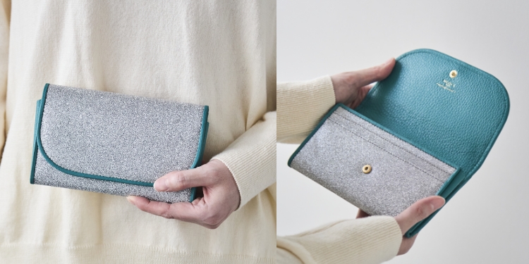 GLITTERは、表側に目が眩みそうなレベルのシルバーのきらきらした生地を使用。内側は落ち着きのあるアボガド色の牛革です。