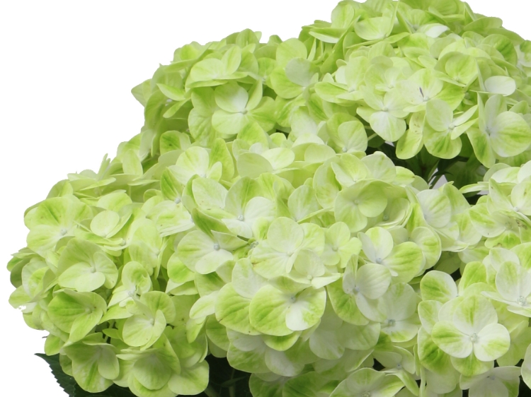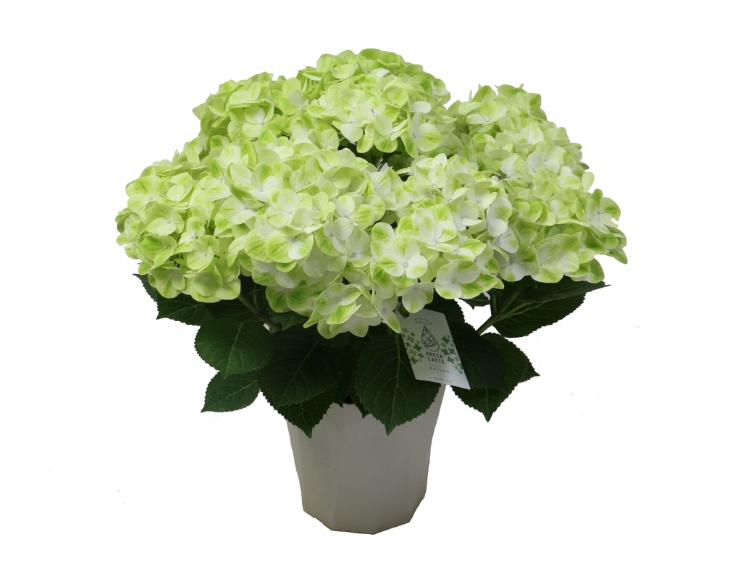 グリーン系の爽やかな紫陽花。花色がグリーン→白→グリーンと変化する面白い特徴があります。その名の通り、抹茶ラテを彷彿とさせる、クリーミーでニュアンスのあるグラデーションが最大の特徴です。一般的なアジサイは花びら(装飾花)が傷みやすいものが多い中、グリーンラテは花弁が厚く丈夫なため、数ヶ月にわたって一鉢で楽しみ続けることができます。