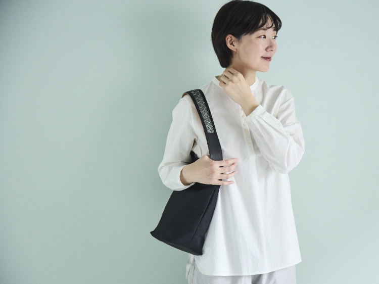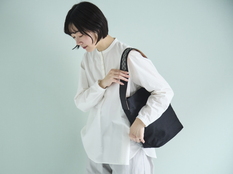帆布のバッグにレザーと手織り生地をプラスすることで、カジュアルになり過ぎずきれい目の装いにも馴染みます。約235gととても軽いので、お出かけの際につい手が伸びてしまう、そんなバッグです。