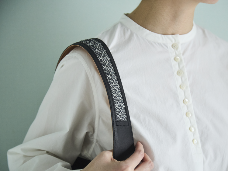 レザーのハンドルの一部をくりぬいて、そこにモノトーンの手織りの生地を挟み込んでいます。ハンドルは2枚のレザーを重ねていてしっかりしているので、耐久性も問題ありません。