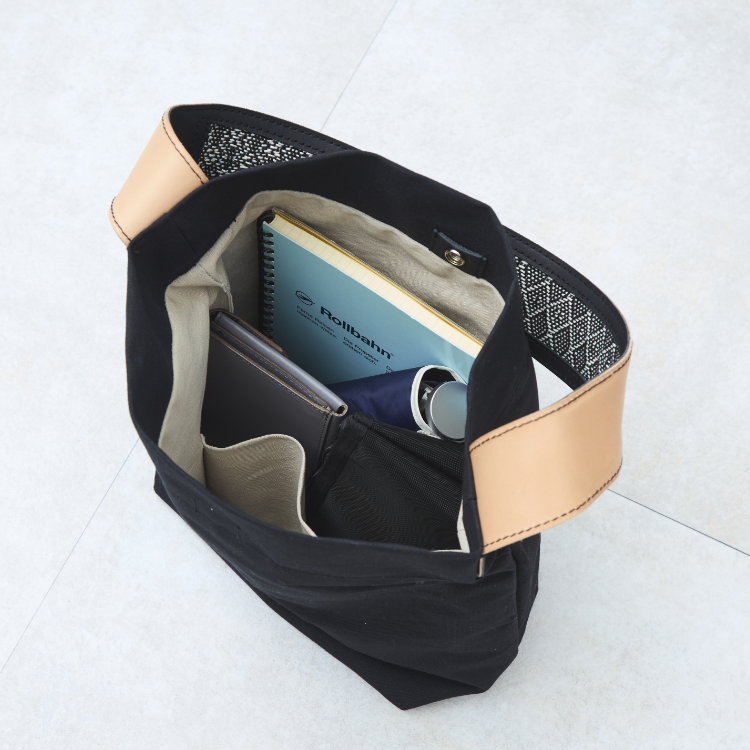 縦長の形は、実は手織りをする際に緯糸をくぐらせるシャトルという道具がちょうど収まるサイズ感なのだそうですが、お出かけに必要なものがすっきり入る大きさでもあります。