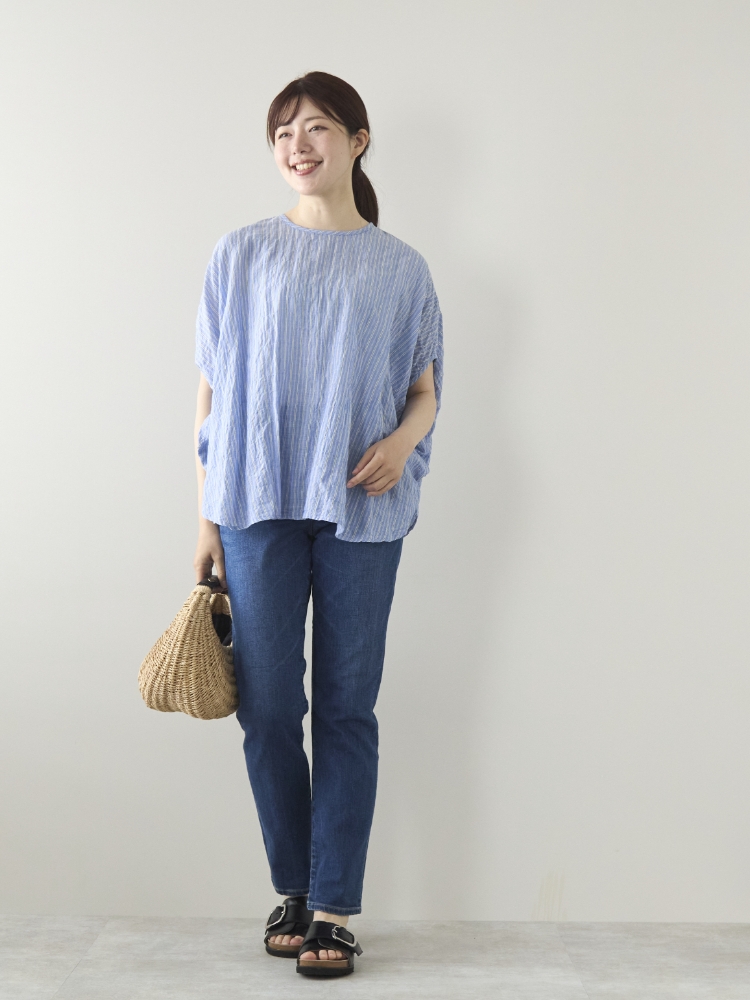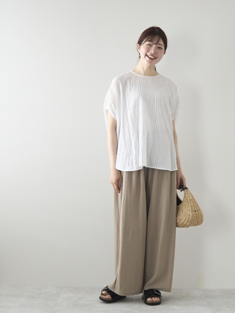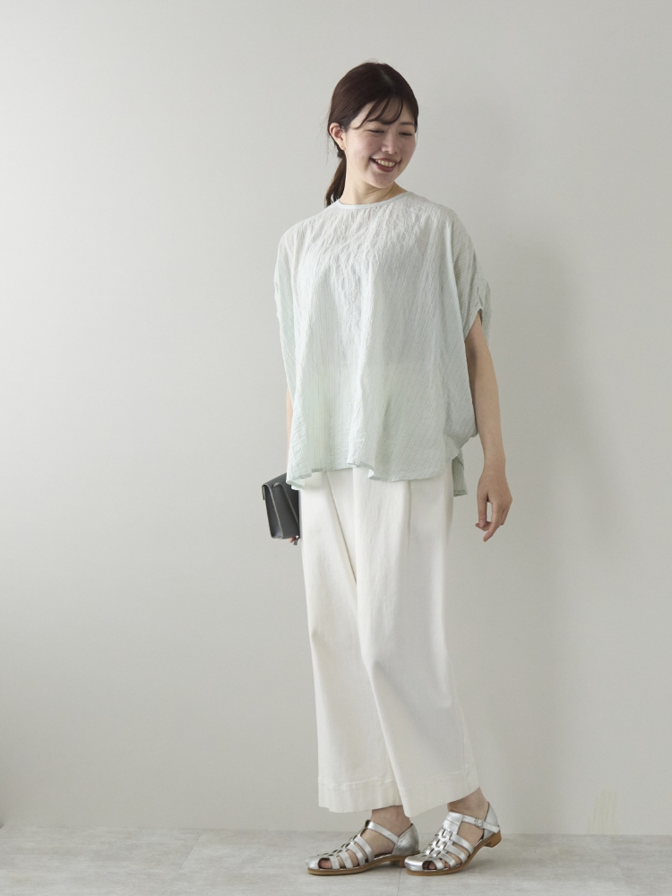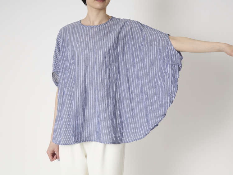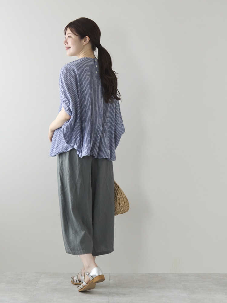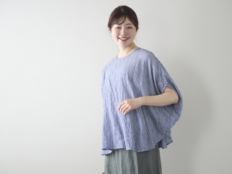 露出を避けながら、涼しさもほしい夏のコーディネートは、いろいろと悩みがちです。半円を描いたようなたっぷりとした分量のプルオーバーは、肘が隠れる長さの袖丈なので、程よく肌見せをカバーしながら涼しく着られます。