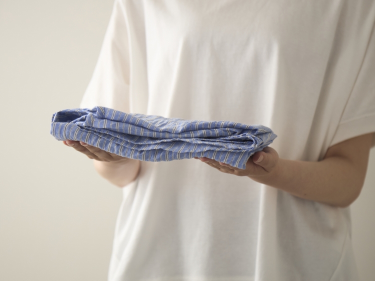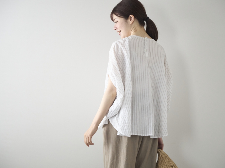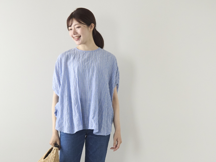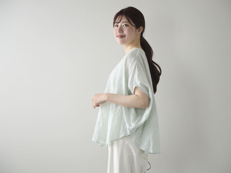 夏服は洗濯回数が増えるし、暑い中でのアイロンはいつもに増して面倒。でも、生地にシボ感があるこちらのプルオーバーは、凹凸から生まれる風合いも魅力のひとつなので、アイロンをかける必要がなく、洗いっぱなしで着られます。