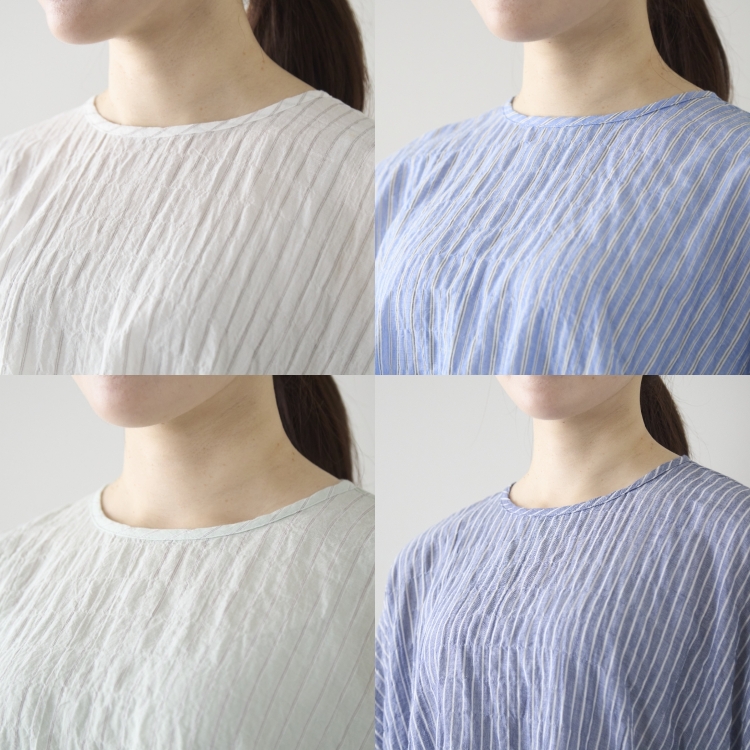シャーリング生地のいいところは、凹凸のある生地によって服と身体の間に風が通り、涼しく着られるところです。
