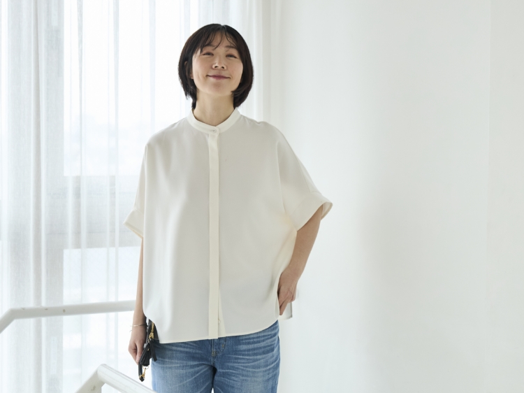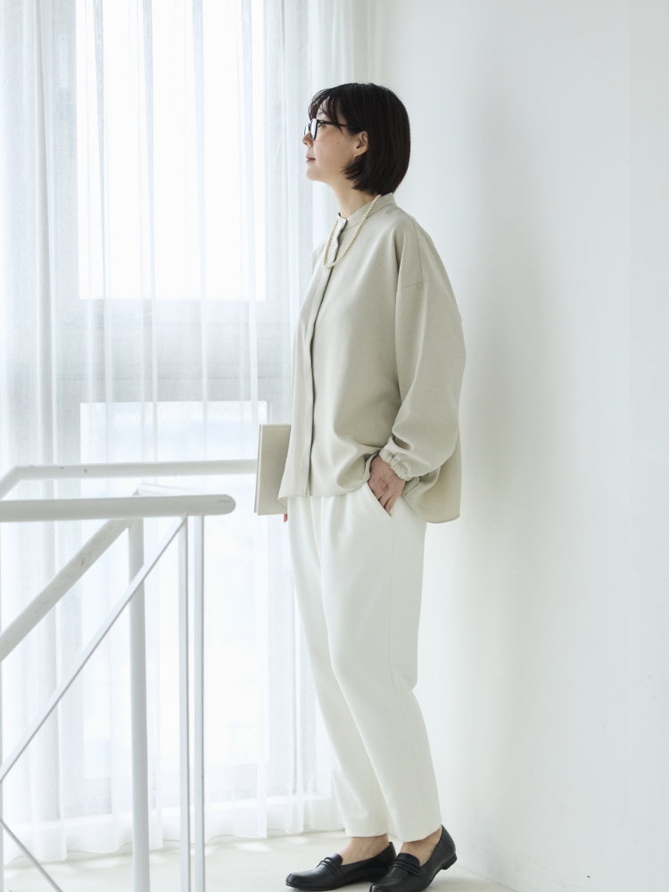 天然素材の高騰対策で始まったブラウスの開発ですが、長袖バージョンも体型を問わず、すっきり品よく見せてくれるうえ、お手入れも簡単な万能な一着になりました。年齢を重ねるにつれ深刻になる汗問題や、お手入れ問題をさらっと解消してくれるブラウスが、忙しい女性の休息時間を1分でも多く作れるといいなと思います。