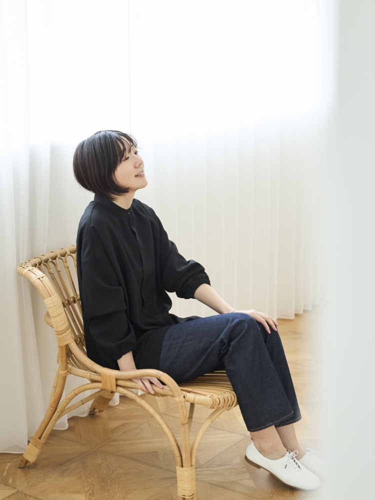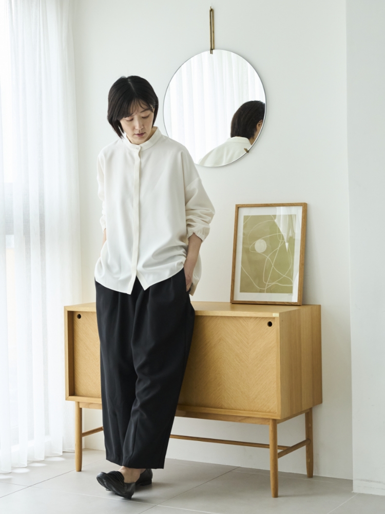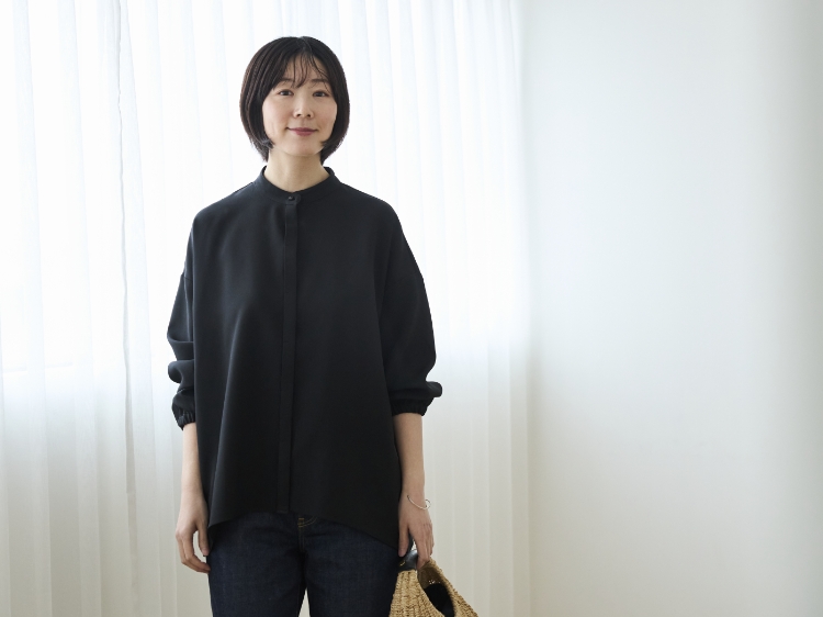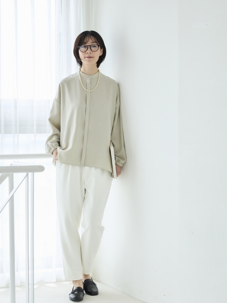 同じ生地で作った半袖バージョンのブラウスは、少しかしこまった場でも着られるテイスト。つるんとした質感でとろみがあるので、きれいめテイストとの相性がいいのだと思います。そんなブラウスを夏だけにとどめておくのはもったいない、という思いから長袖バージョンを作るに至りました。