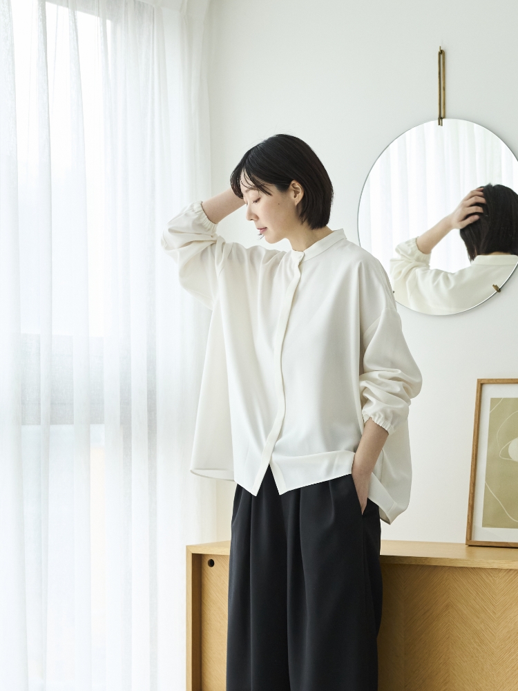 昨年Kilka(キルカ)で販売し、たちまち大人気となった半袖ブラウスと同じ生地を使って、長袖ブラウスを作りました。一躍人気アイテムとなった半袖ブバージョンはあくまでも夏を快適に過ごすための服。でもつかい手の皆さんの声を拝見すると、その生地の機能性の高さに対するお褒めの声も多く、同じ生地の長袖シャツを作れば、オールシーズンを通して、着る人が楽できるのでは?と思ったのです。着まわしがきくようにこだわった長袖ブラウスは、一年を通してきれいめコーディネートの担い手となってくれる一着です。