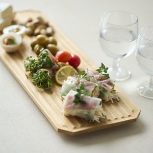 「シャルキュトリーボード」の大きさは、W450×D147×H18mmと長細い形。シャルキュトリーとは、ハムやソーセージ、パテなどのお肉の加工品のこと。サラミやチーズなどの料理を盛り合わせれば、友人たちを集めたワインパーティーなどのおもてなしシーンなどに活躍します。