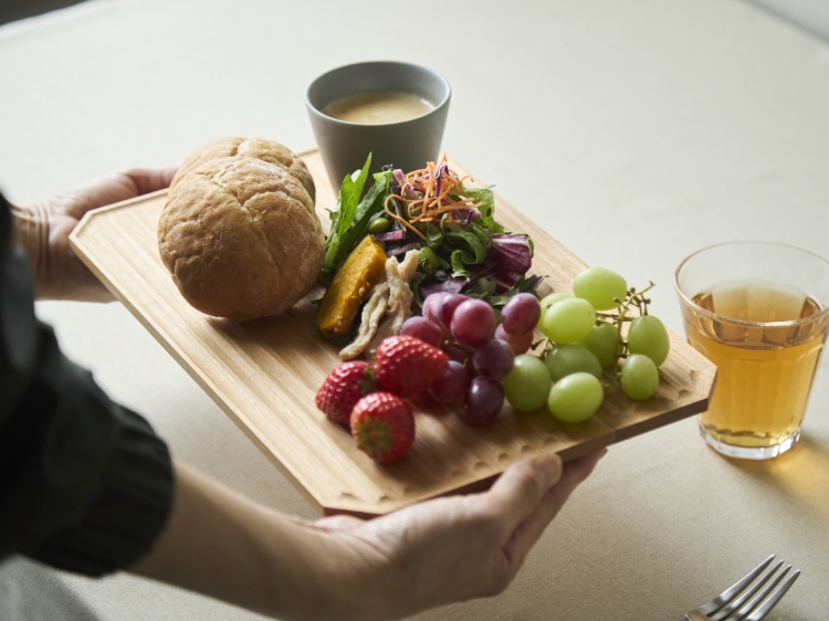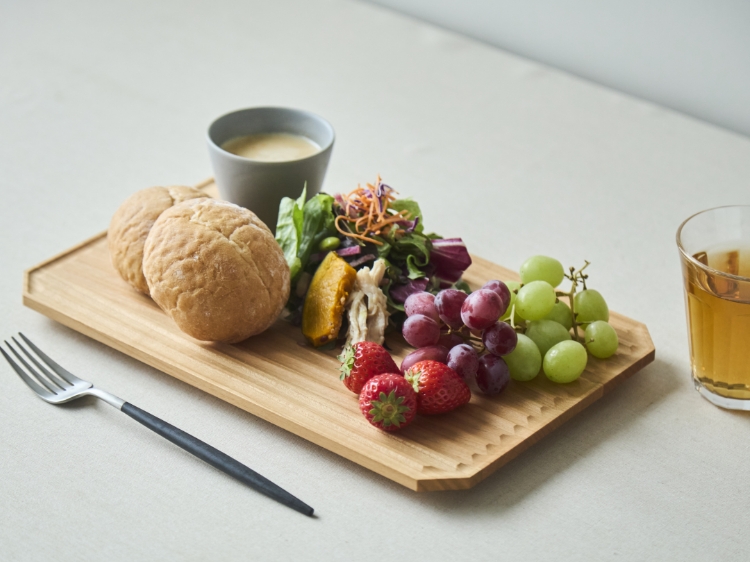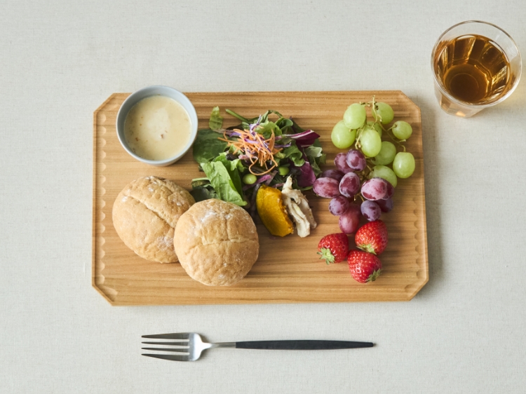 溝の間隔がヨーグルトの器やマグカップを乗せてもグラつかない設計になっているので、これ一枚でプレートとしてもトレーとしても活躍してくれます。