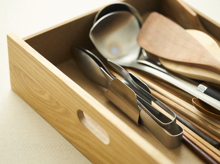 そんなトングの収納に役立つのが、EAトCOの「Tomelu(トメル)」。専用のホルダーだから広がるトングをコンパクトに収納でき、引き出しの中をすっきりと整理できます。トングを浮かせた状態で保てるので、調理中や食事中の一時置きにも重宝します。トングの利用頻度が高い方におすすめです。