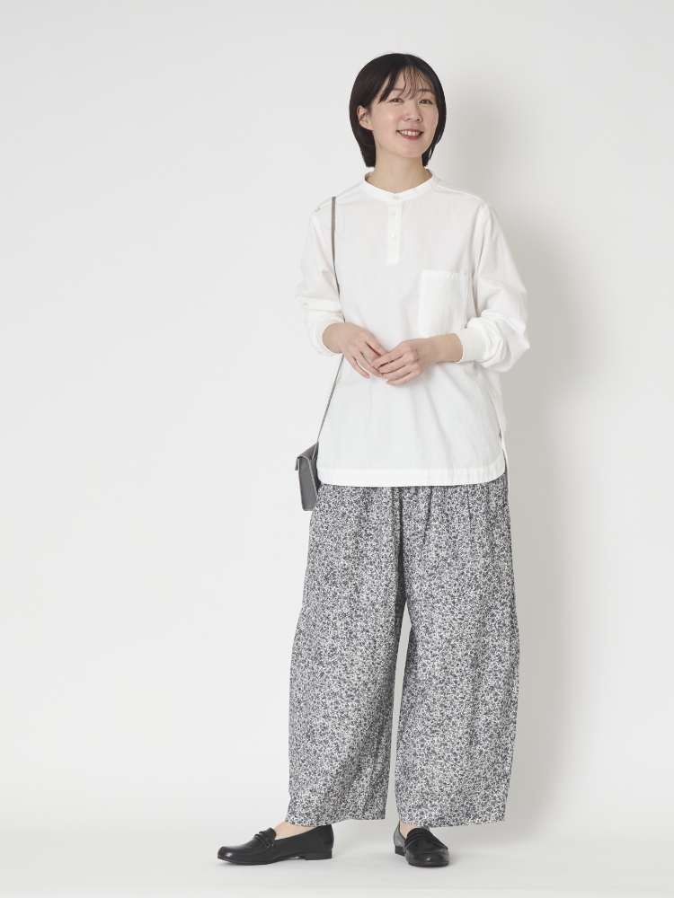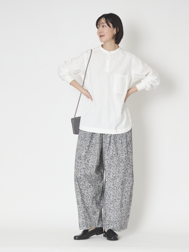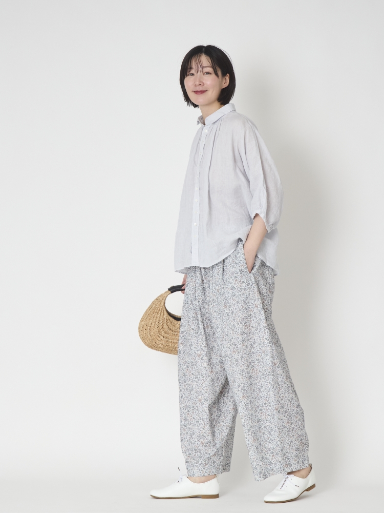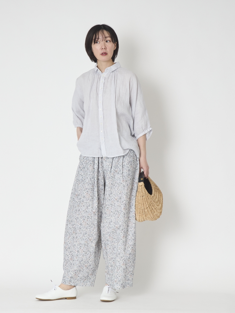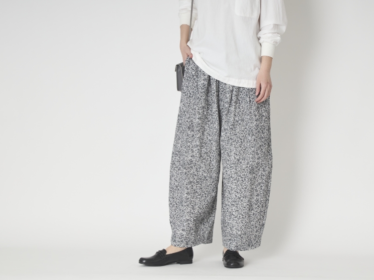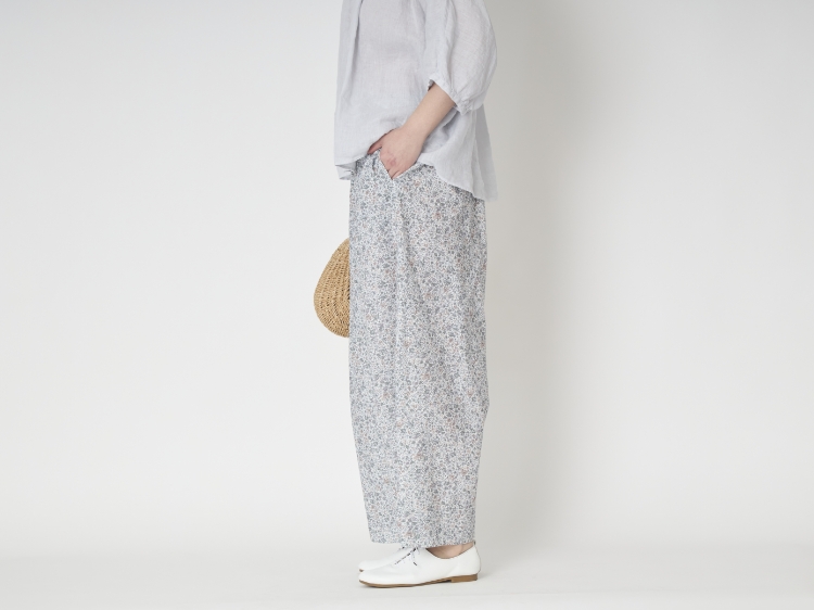 TUTIE.(ツチエ)がこの春にイチオシしているのが、ゆったりとしていて、裾に向かって緩やかにカーブを描くシルエットのパンツです。どんな身長の方でもすっきりはけて、かつ涼しいのがこの型のパンツの特徴です。そんなカーブパンツを、小花柄の綿麻生地で作ったのもいいところ。春夏シーズンらしいさわやかさと、コーディネートのしやすさ、汗の不快感を払拭する生地選びと、ブランドのこだわりが詰まった一着です。