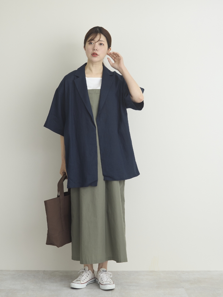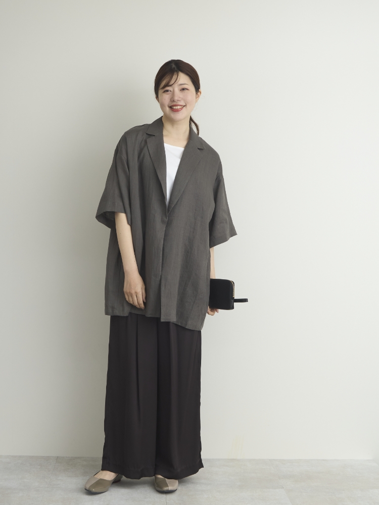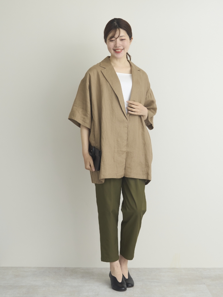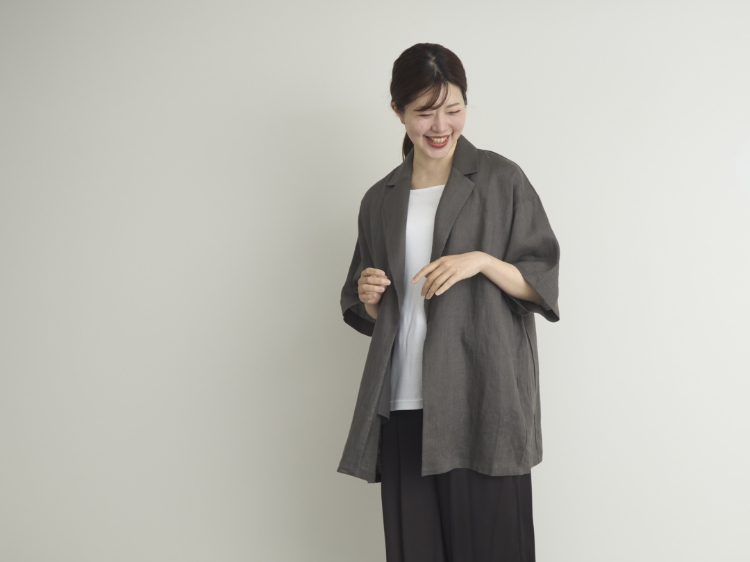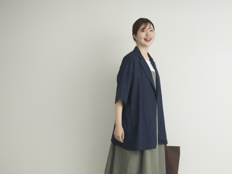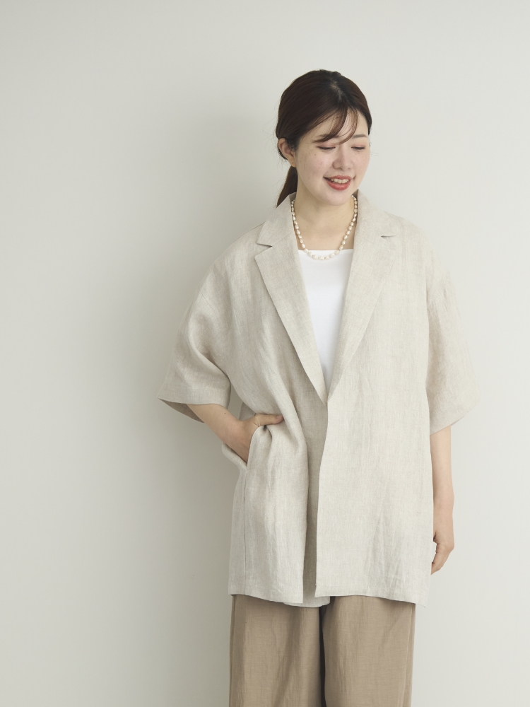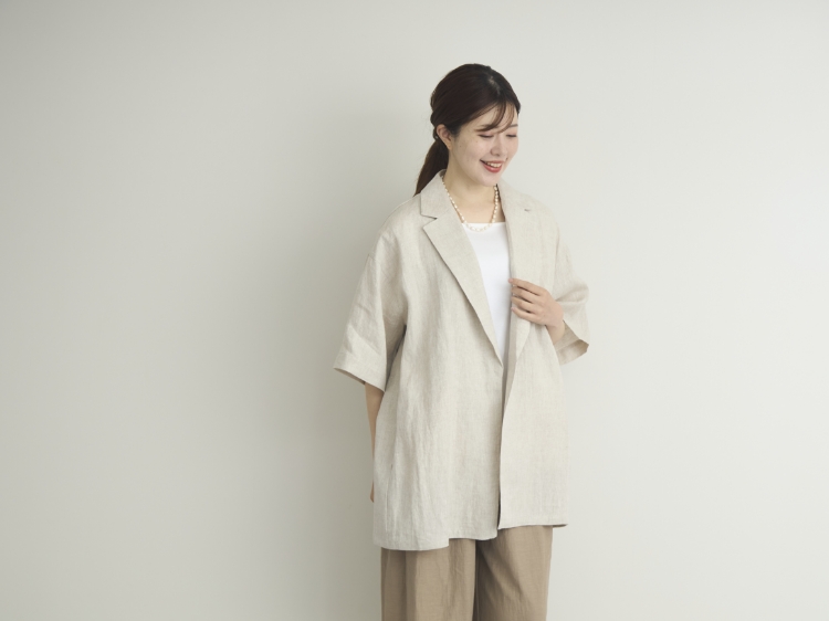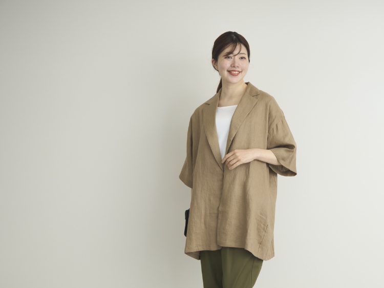 こちらは、テーラードのきちんとした印象を持ちつつも、リネン素材で抜け感をプラスしたちょうどいい塩梅のデザインになっています。