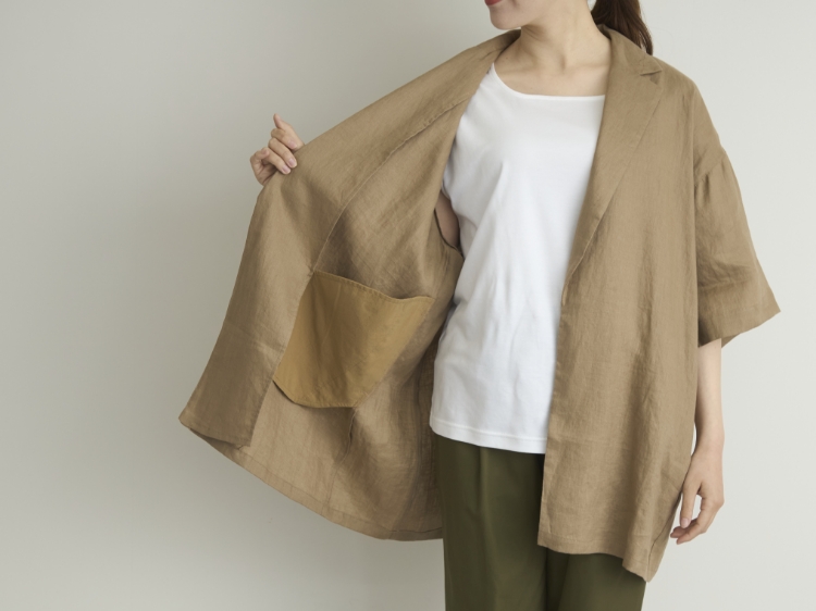 前ボタンはなく、裏地もありません。お仕事の際に着るようなかっちりしたジャケットと比較すると、印象はかなりラフですが、身幅も袖もゆったりとしていて風通しが良いので、とにかく涼しいのがいいところ。紫外線や屋内外の寒暖差対策に重ね着をしても涼しくストレスがありません。