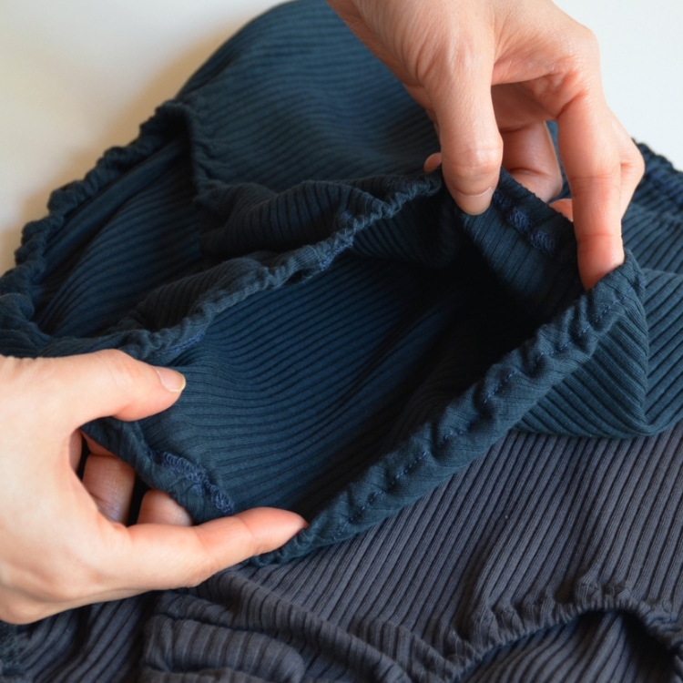 また、縫製の際には、一般的なポリエステル糸を使わず、綿糸で縫っているのもこだわりのひとつ。伸縮性の高い生地を綿糸で縫製するのは高い技術を要するのだそうですが、綿糸は何度もお洗濯を重ねるうちに、生地に馴染むので、長く着るほどに肌触りの良さにつながります。「年齢を重ねて肌が敏感になってきた」「素材のごわつきがストレスになる」という方も、快適に着用できますよ。