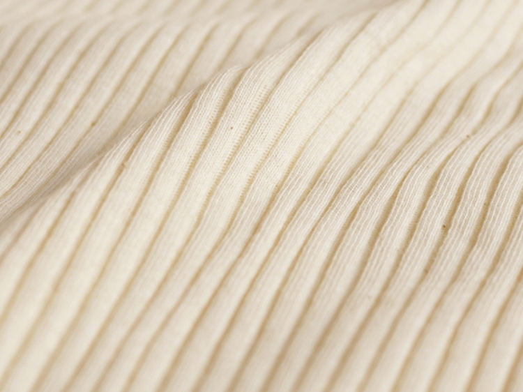 快適さのポイントは「リブ編み」にあります。伸縮性のある化繊を使わずコットン100%ですが、編み方をリブ編みにすることで抜群の伸縮性を実現しました。