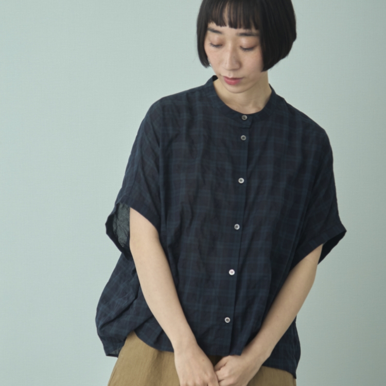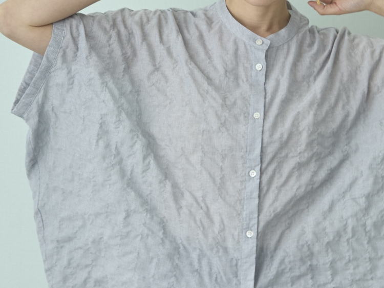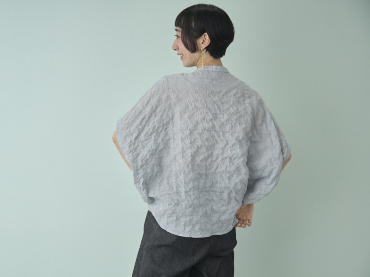 柔らかな生地にシャーリング加工を施して凹凸を出しているので、肌にまとわりつかず快適な着心地。軽く、涼しく、汗はすぐ乾き、ノーアイロンで着られる、酷暑を乗り切るのにぴったりの素材を、風通しの良いドルマンシャツに仕立てました。