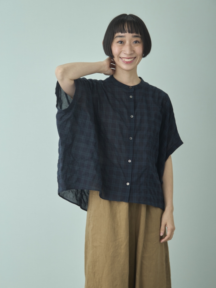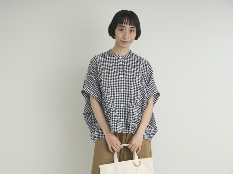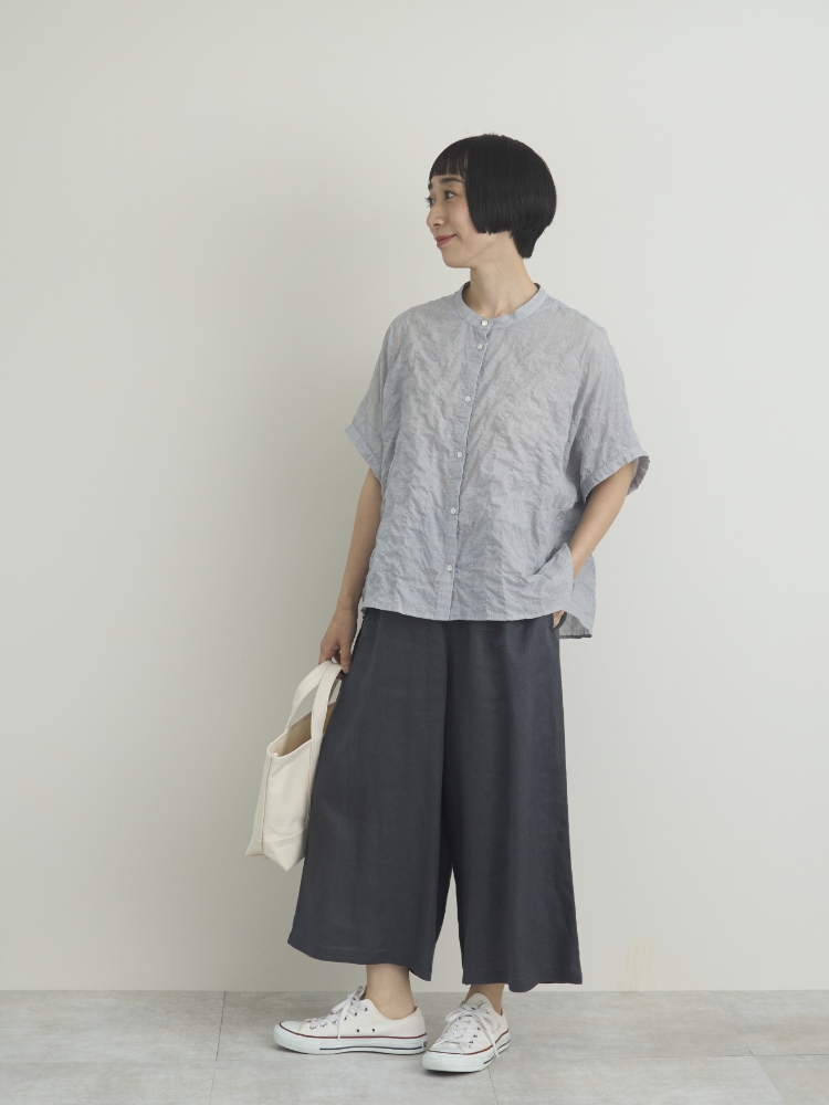 首回りはバンドカラー。詰まりすぎないデザインなので、上までボタンを留めてもほどよいゆとりがあります。清潔感とリラックス感のある印象を与え、柔らかい雰囲気ながら、きちんとしたスタイルになるのが特徴です。