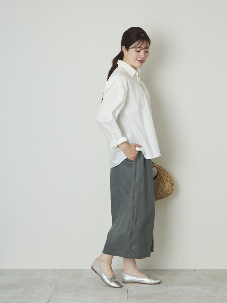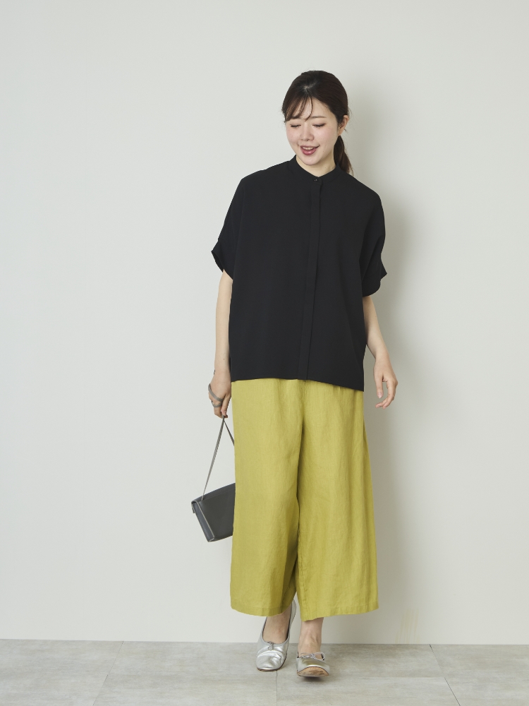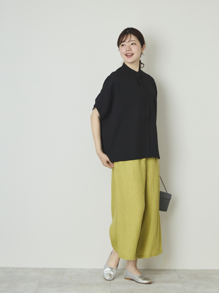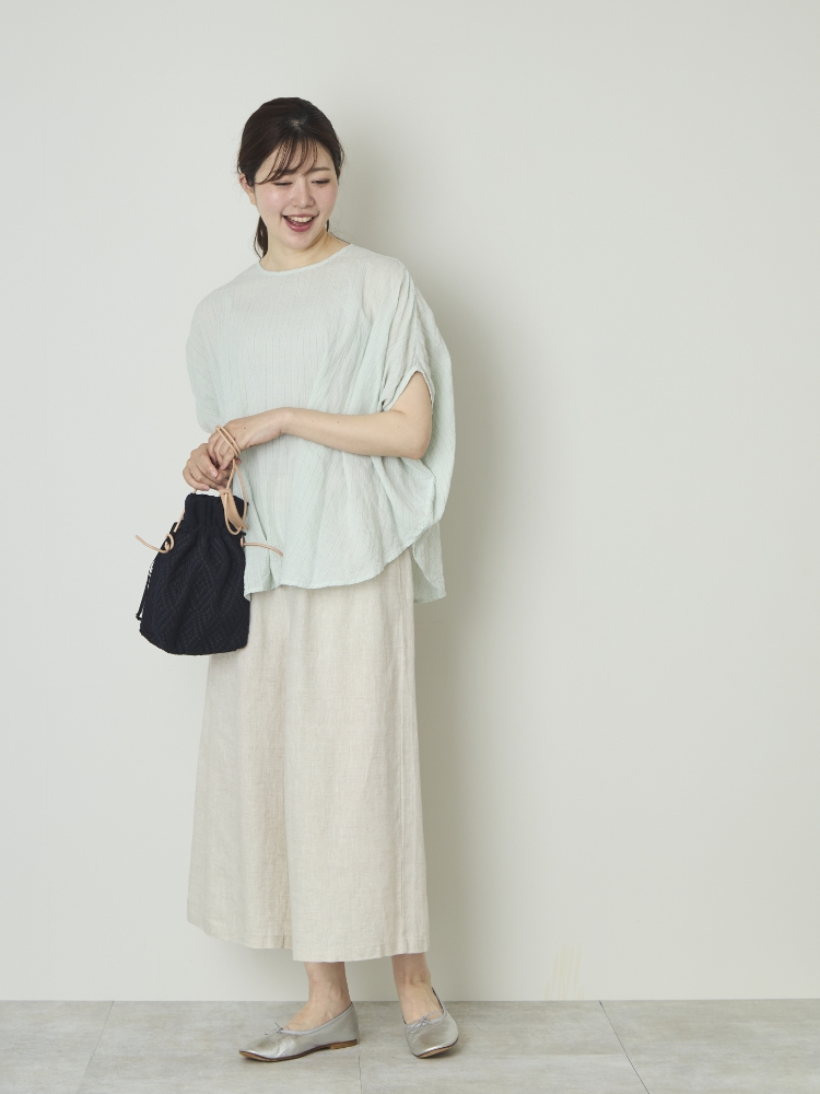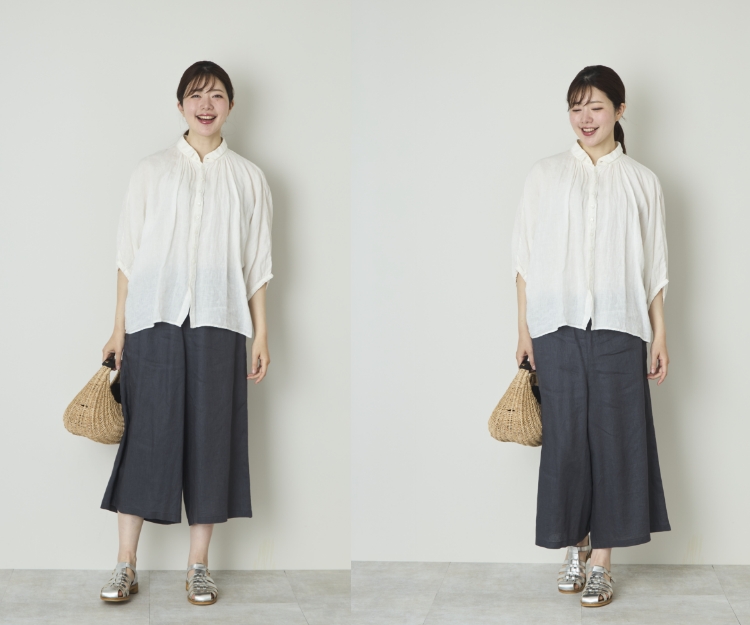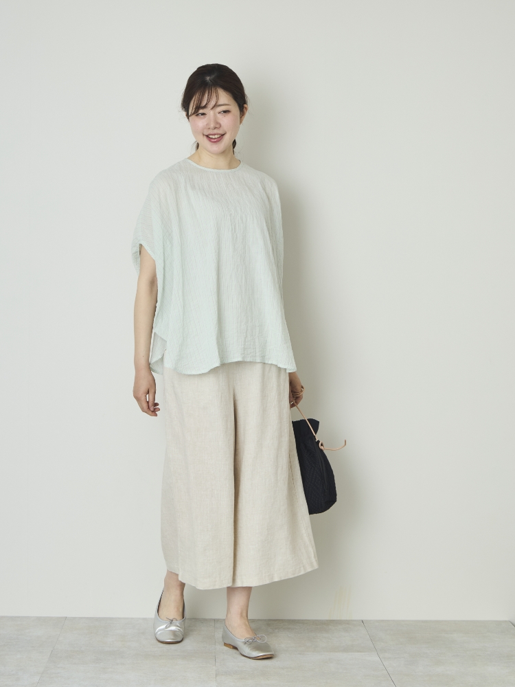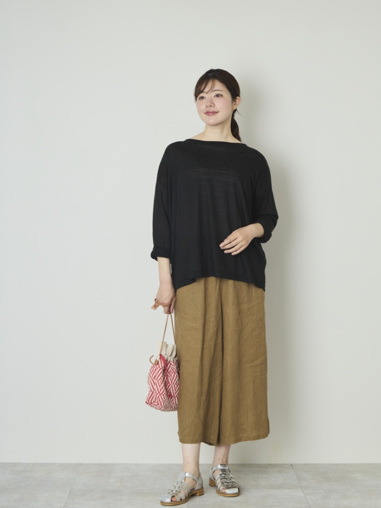 こちらは、身長153cmの当店スタッフがこのパンツを穿いた時の画像です。パンツ丈は足首がのぞく9分丈くらいで、ワイド型でも重くなりすぎていないのが分かります。「リネン特有のとろみがあって、カジュアルになりすぎないのがいいですね。これならば、オフィスカジュアルとしても着られそうです。」との事。